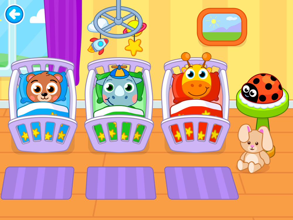In this game you explore a special kindergarten for animals. You can take care of a giraffe, a bear and a rhino here. You will play with baby animals, wash them, feed them and put them to bed. Fun entertainment is playing on the playground, where your wards are waiting for a trampoline, skating rink, pool, ferris wheel and other interesting entertainments. You can play different speed games together with small animals. Here you have the opportunity to pop up balloons, put vegetables and fruits into special containers. You will also get into the jungle, where you can see real wild animals, jump on a rainbow, play with kitties and even fly into space.