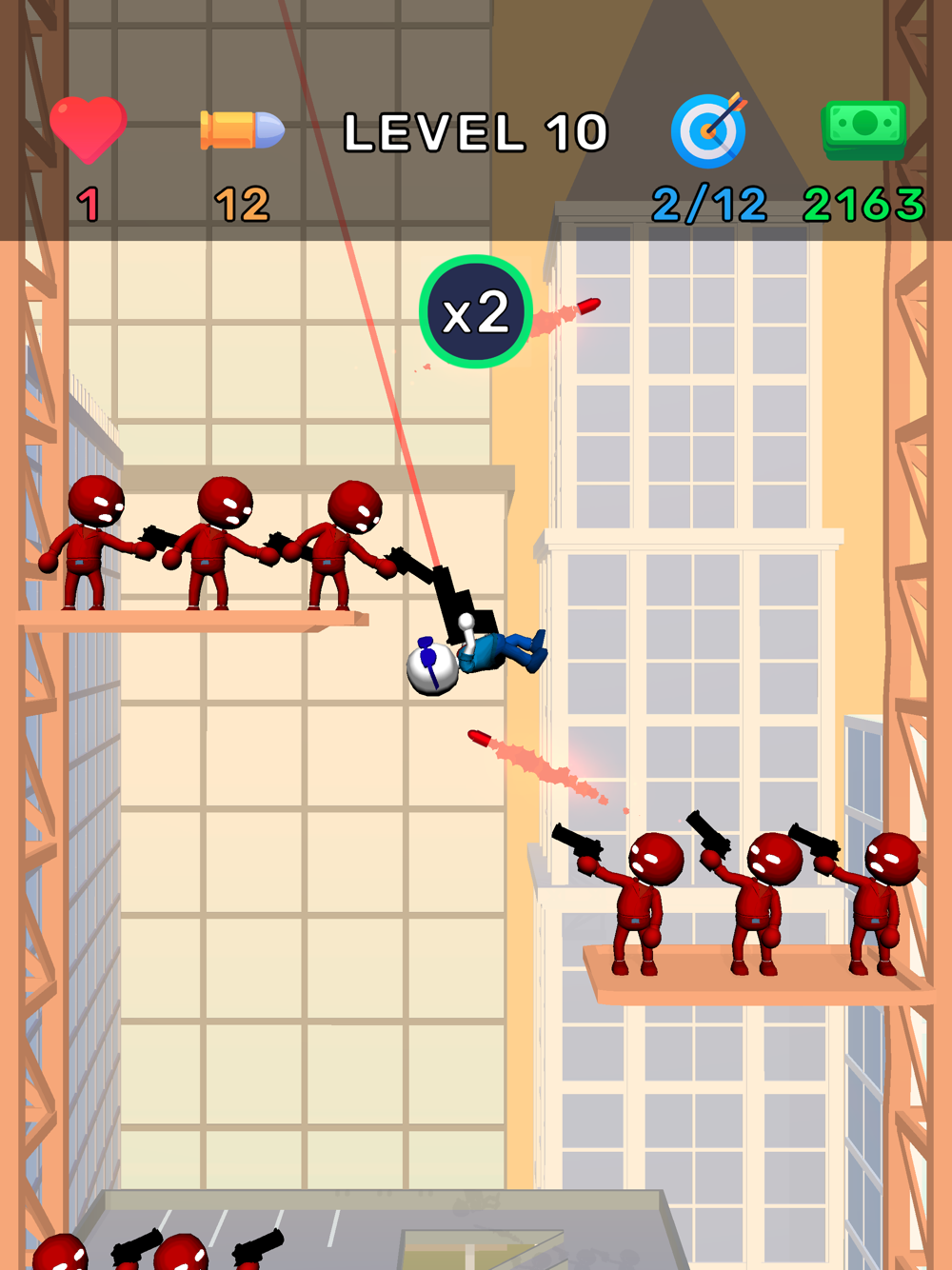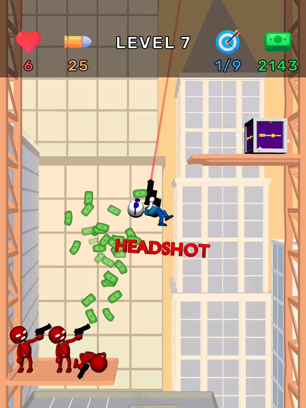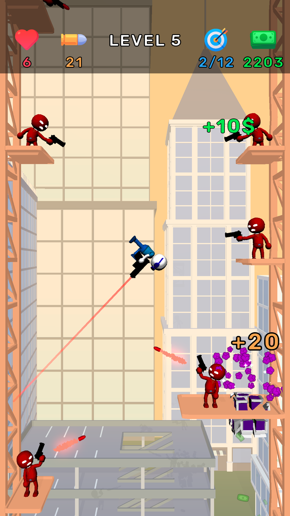 You're a hired hitman who has to take out his enemies! Shoot your enemies, fly epically across the map, collect bonuses, and upgrade your hero and his weapon!
