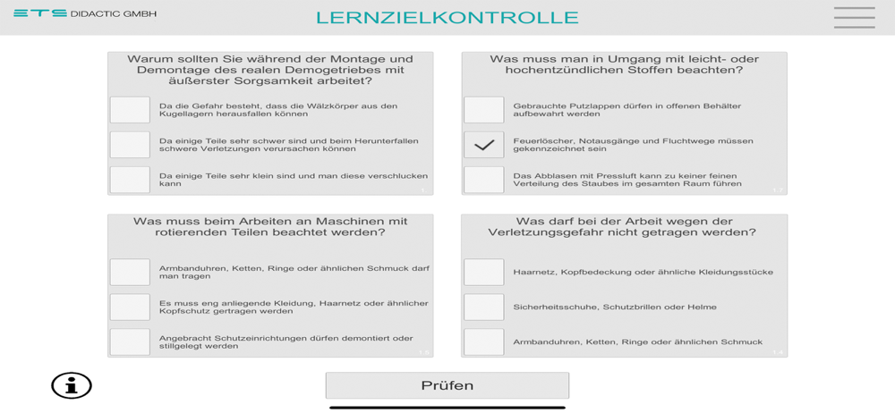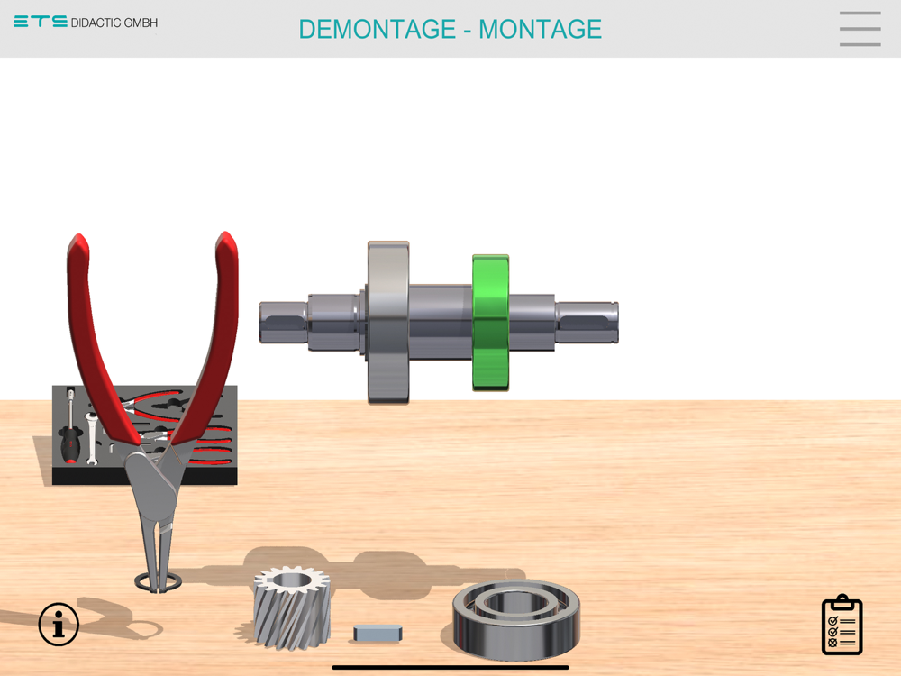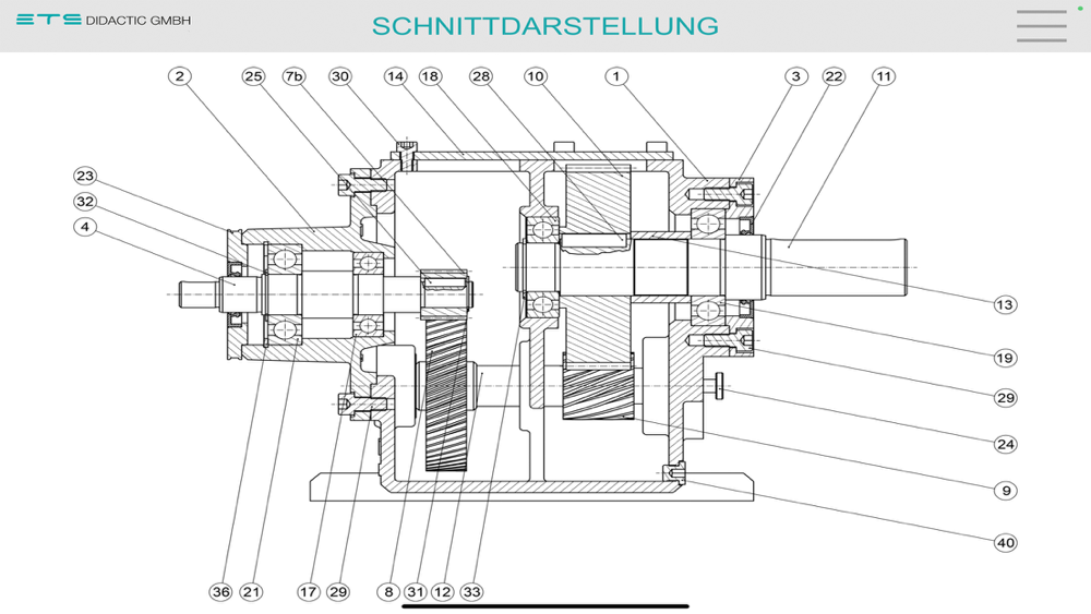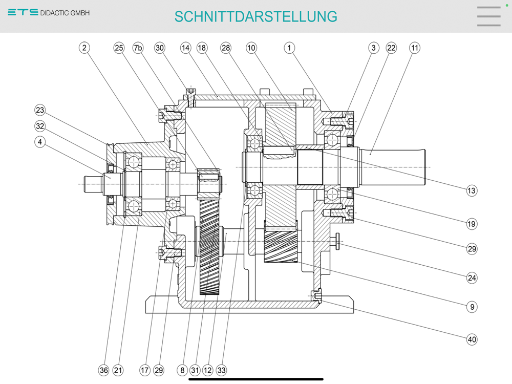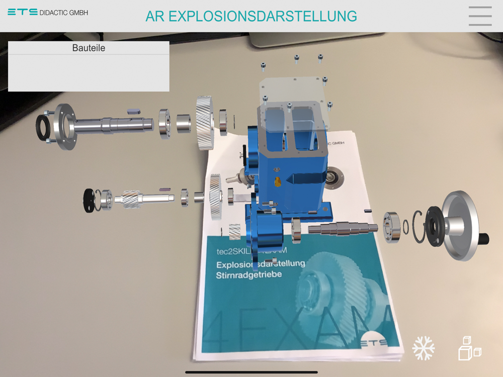 Die Lernanwendung tec2SKILL® 4EXAM ist ein digitaler Assistent zur didaktischen Unterstützung im Bereich der Getriebetechnik. Es werden industrielle Getriebe-Bausätze von der ETS DIDACTIC GMBH unterstützt.
