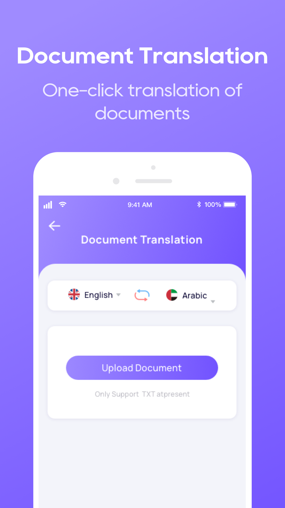 - Document-to-Text- Support TXT format, documents get translation.