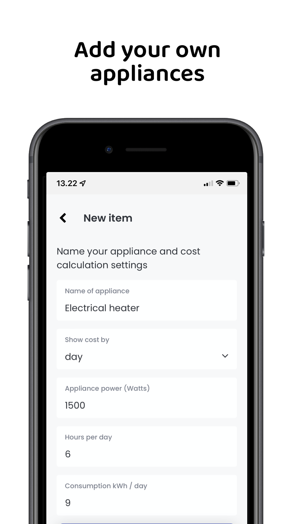 Quick and simple electricity cost calculator for calculating costs of using home appliances.