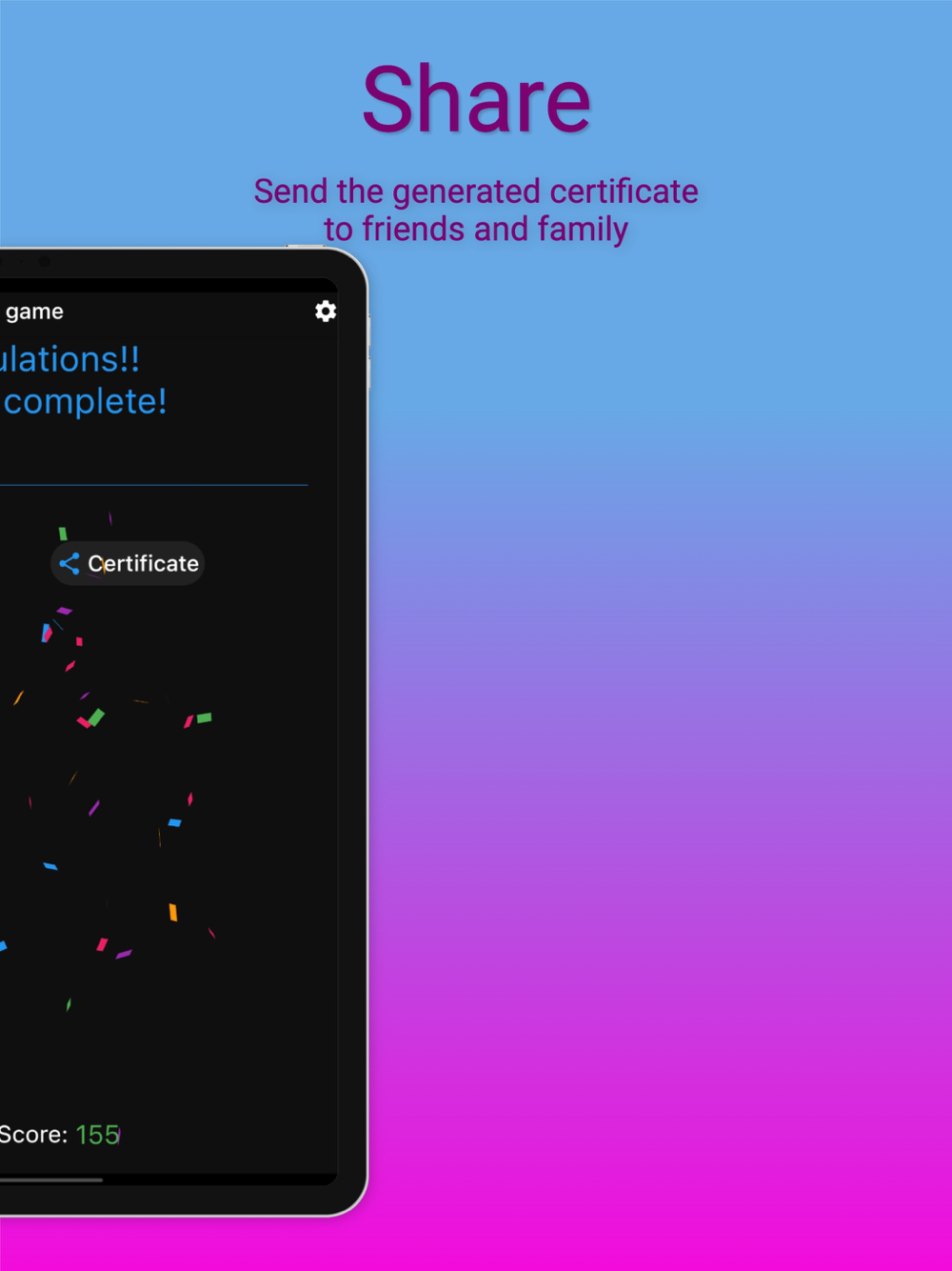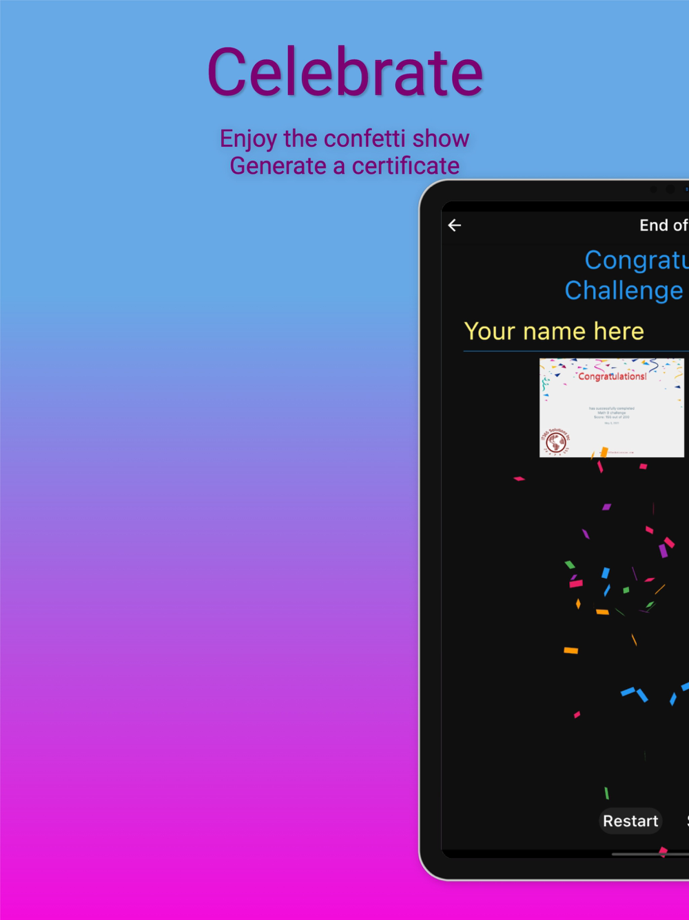 There are 100 questions/levels sprinkled with some interesting Math puzzles in between. Create and share a certificate of your final score. Challenge your friends and family to see who can score the most.