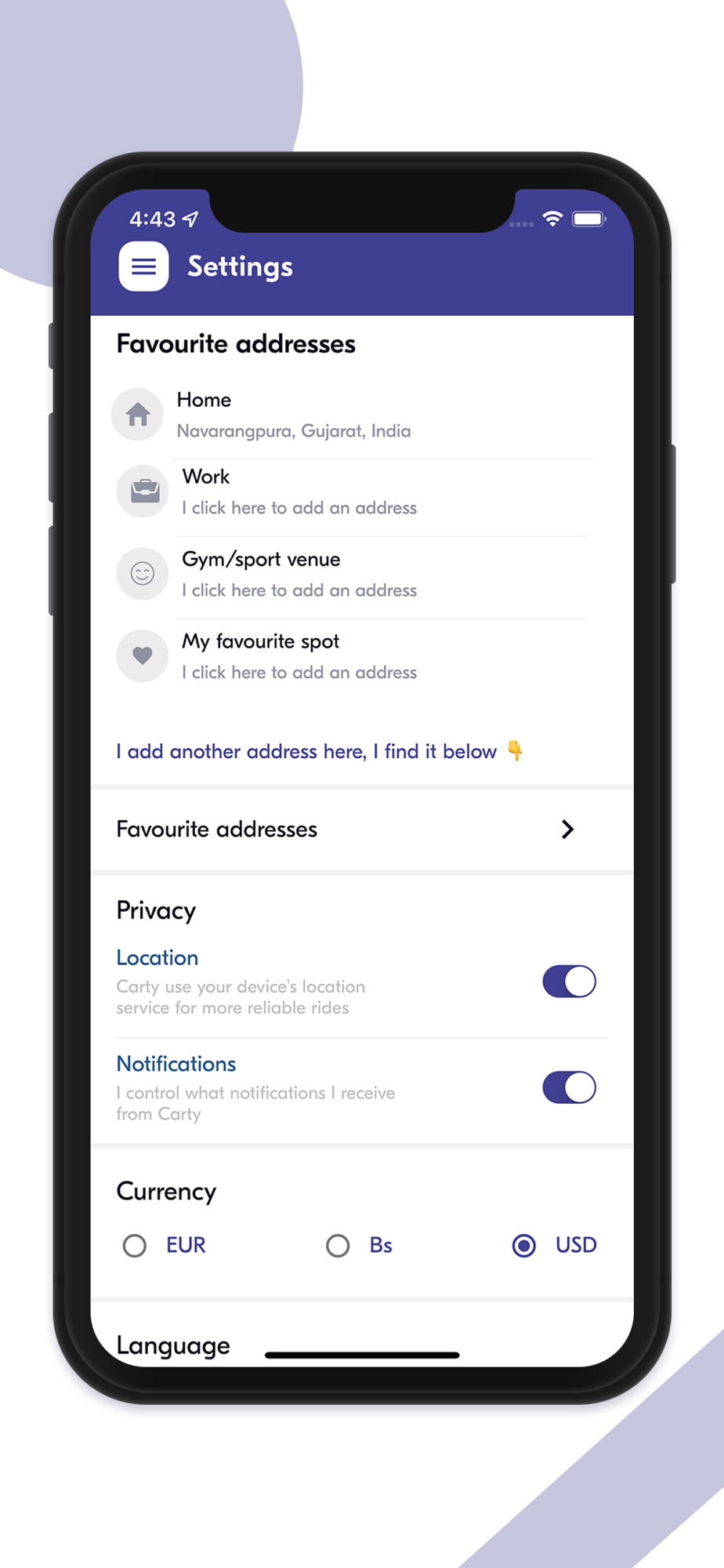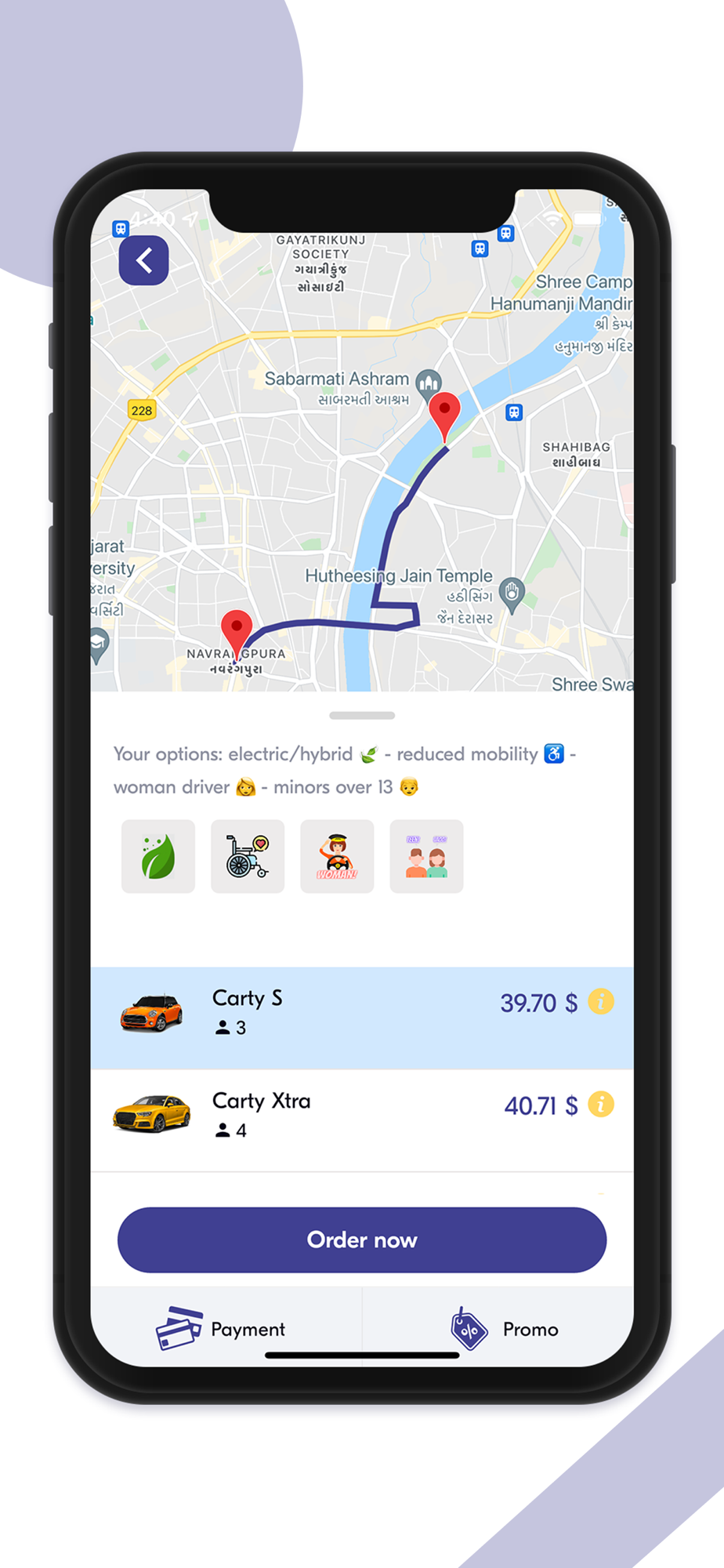 Safe travel comes first. All of Carty's drivers go through a selection process and only the very best qualify. With added security, you can share your rides with trusted contacts in real time. In an emergency, press the safety button.