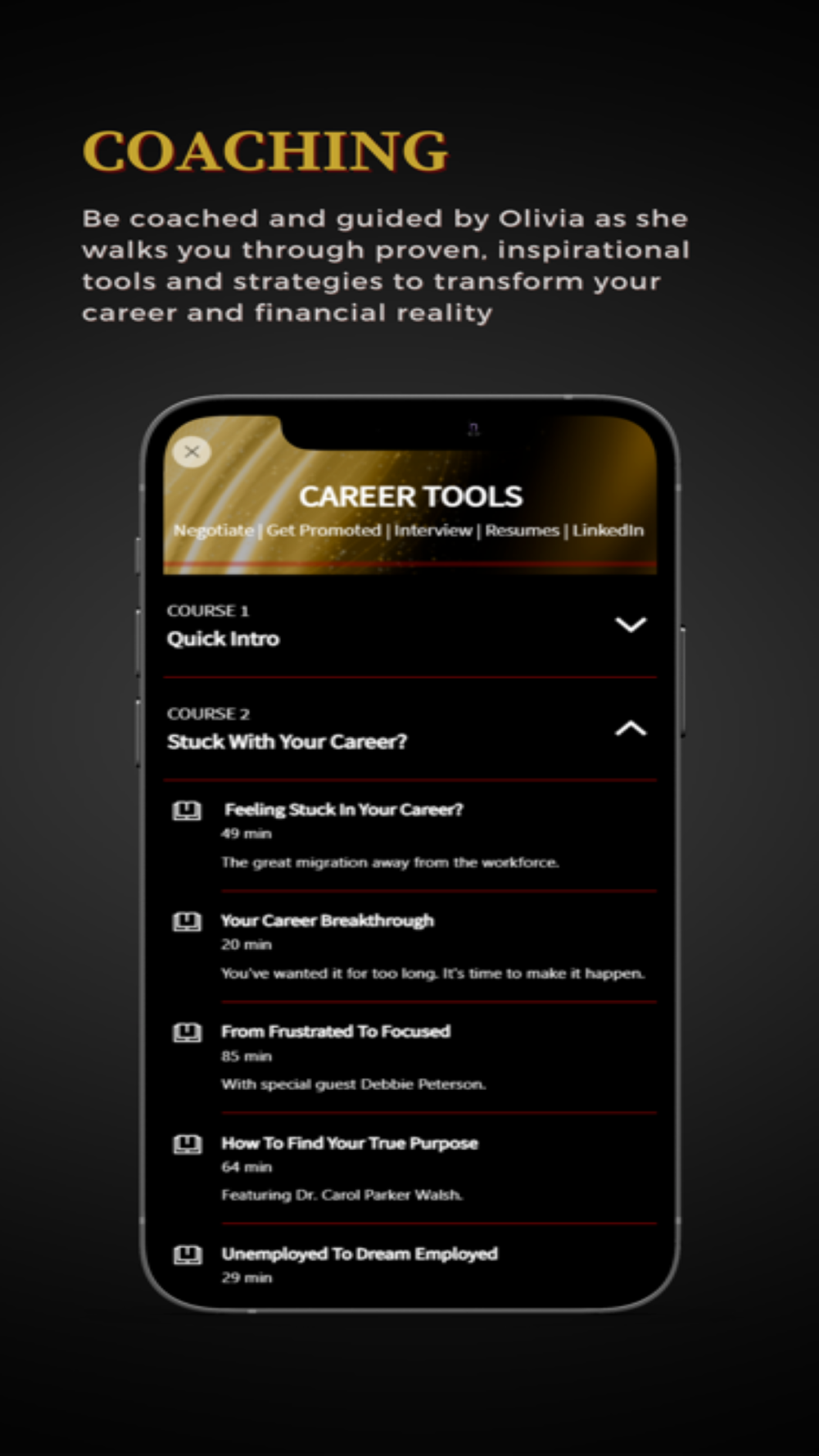 Be coached and guided by Olivia herself as she walks you through her proven training systems for career and professional growth.