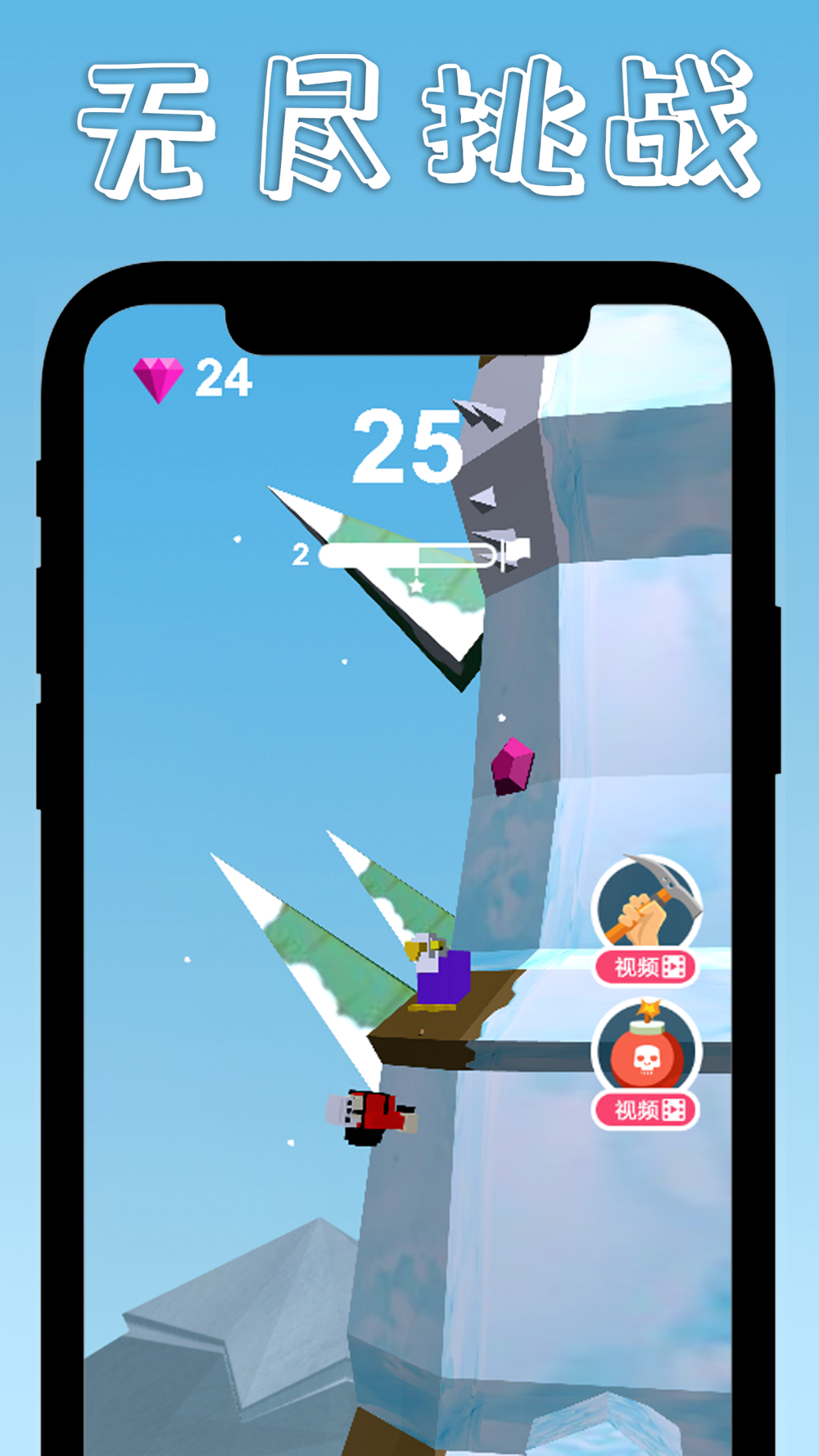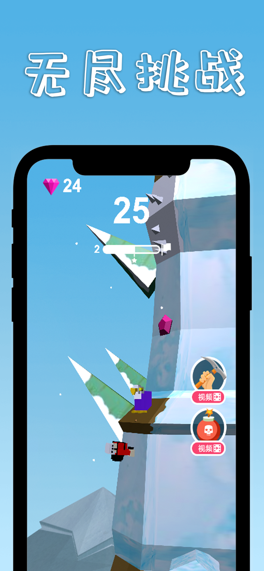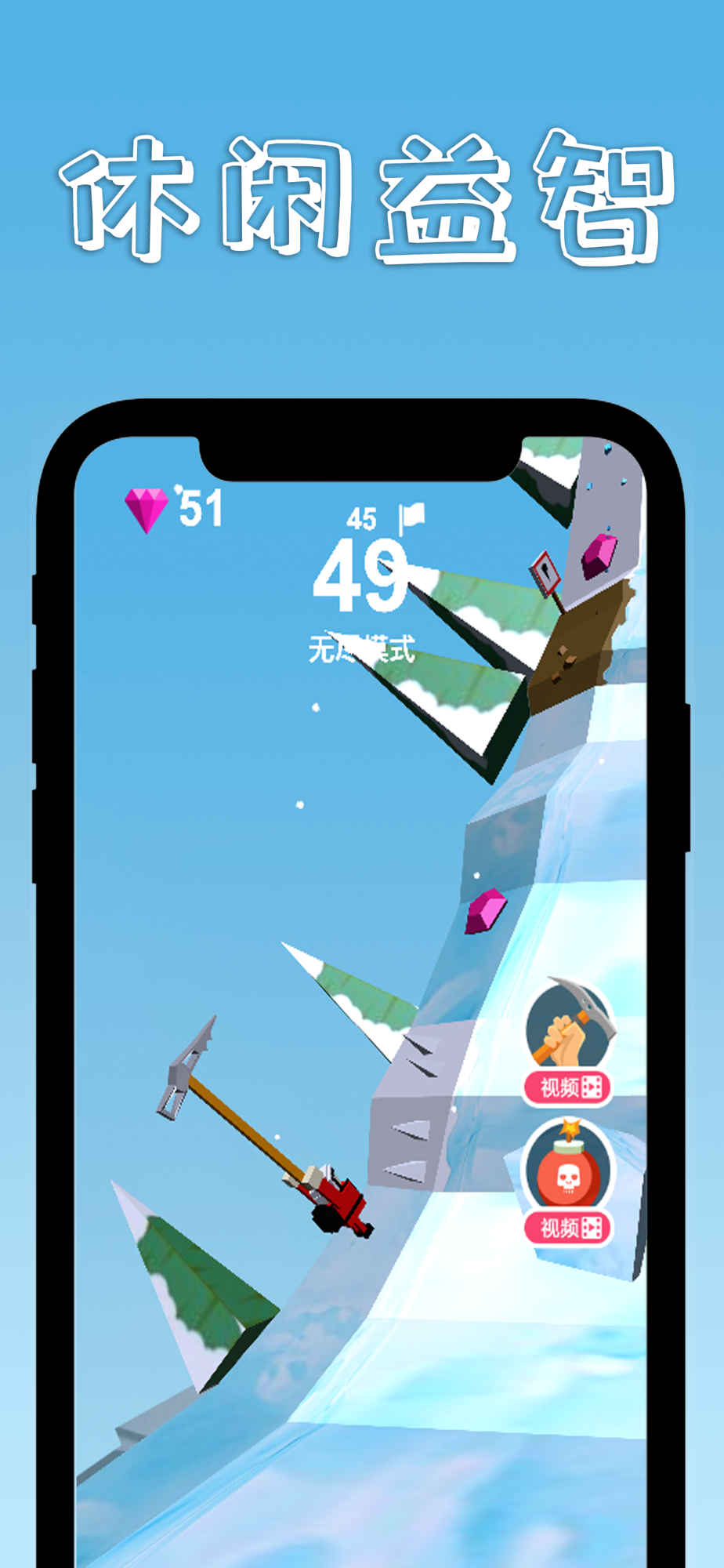 这是一款好玩的雪山探险小游戏,在游戏中我们需要按住屏幕登山锤手柄变长,松手开始攀登,登山过程中要注意避开各种危险!