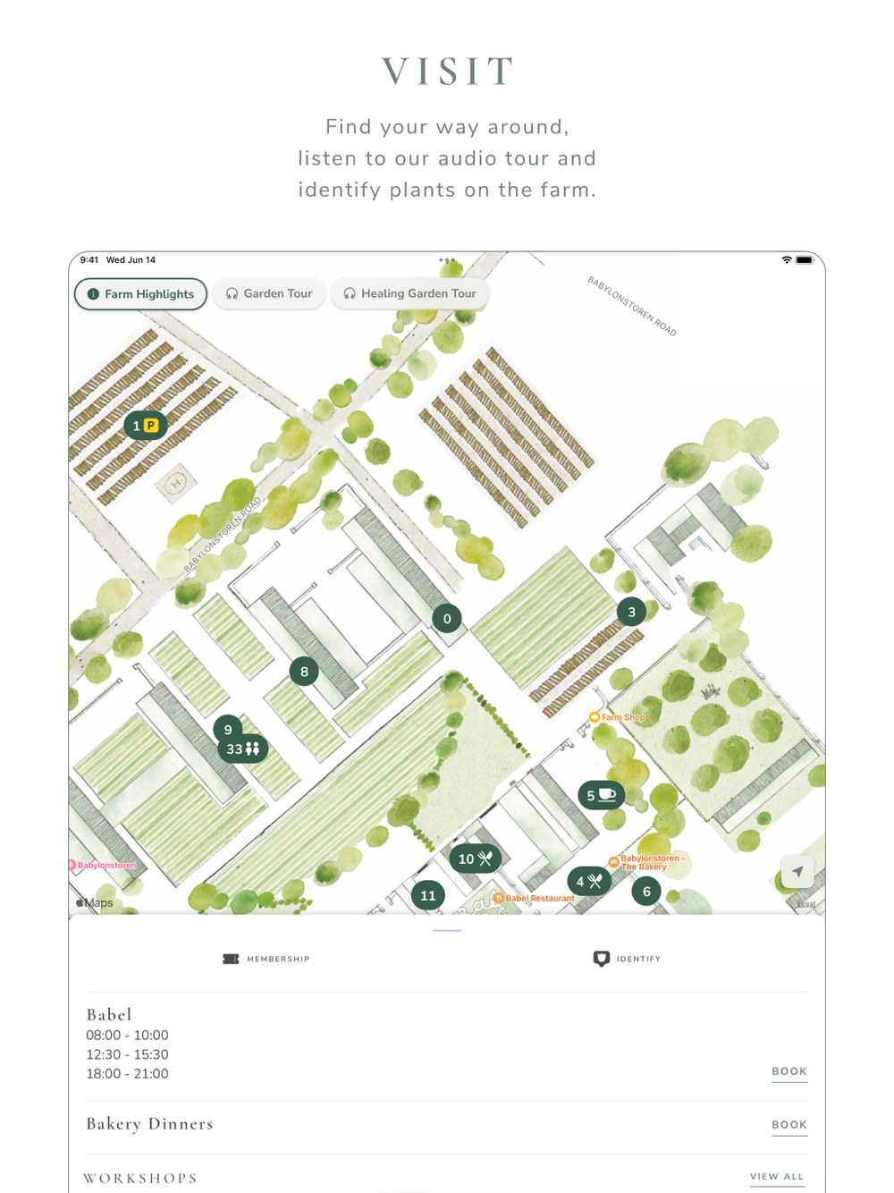 Get easy access to our garden membership, an interactive farm map and audio guided garden tour. You’ll be able to identify plants on the farm or at home, and receive the latest farm news. Book your next workshop or restaurant visit directly from the app.