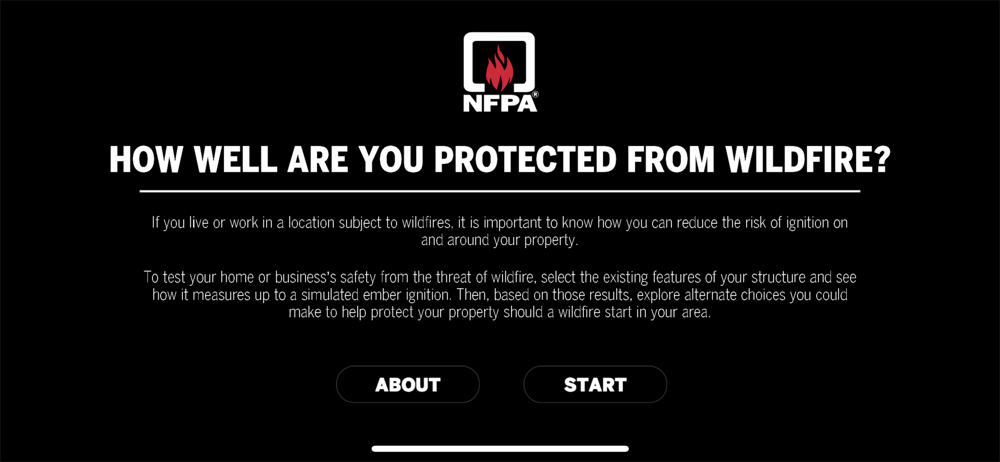 DISCLAIMER: The sole purpose of this simulation tool (“tool”) is to circulate information about some ways to help reduce wildfire risk. The tool cannot account for all factors that affect wildfire risk and anyone using this tool should rely on his or her own independent judgment or, as appropriate, seek the advice of a competent professional. It is provided AS IS and AS AVAILABLE without guarantee or warranty of any kind and without representation or warranty regarding the accuracy, completeness, usefulness, timeliness, reliability or appropriateness. NFPA assumes no responsibility or liability in connection with the information contained in or expressed by this tool, its use or output.