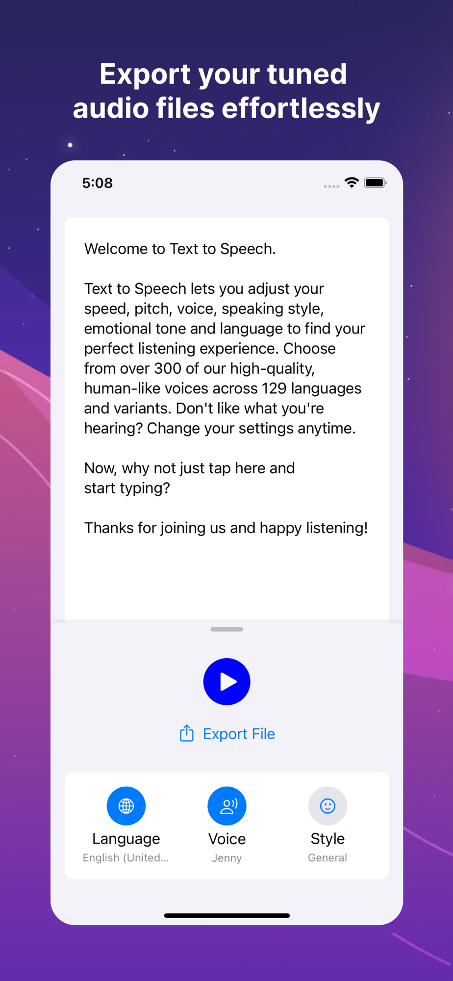 With the Text to Speech app turn your text into lifelike synthesized speech. Enable fluid, natural-sounding text to speech that matches the intonation and emotion of human voices. Text to Speech can export your tuned audio files effortlessly, thereby lets you create a high-quality audio file and download the output for other uses.