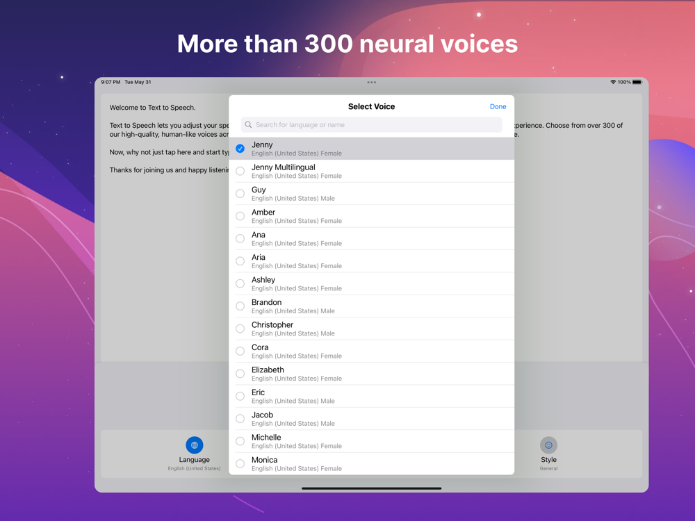 • Choose from over 300 of our high-quality, human-like voices across 129 languages and variants. Don't like what you're hearing? Change your settings anytime.