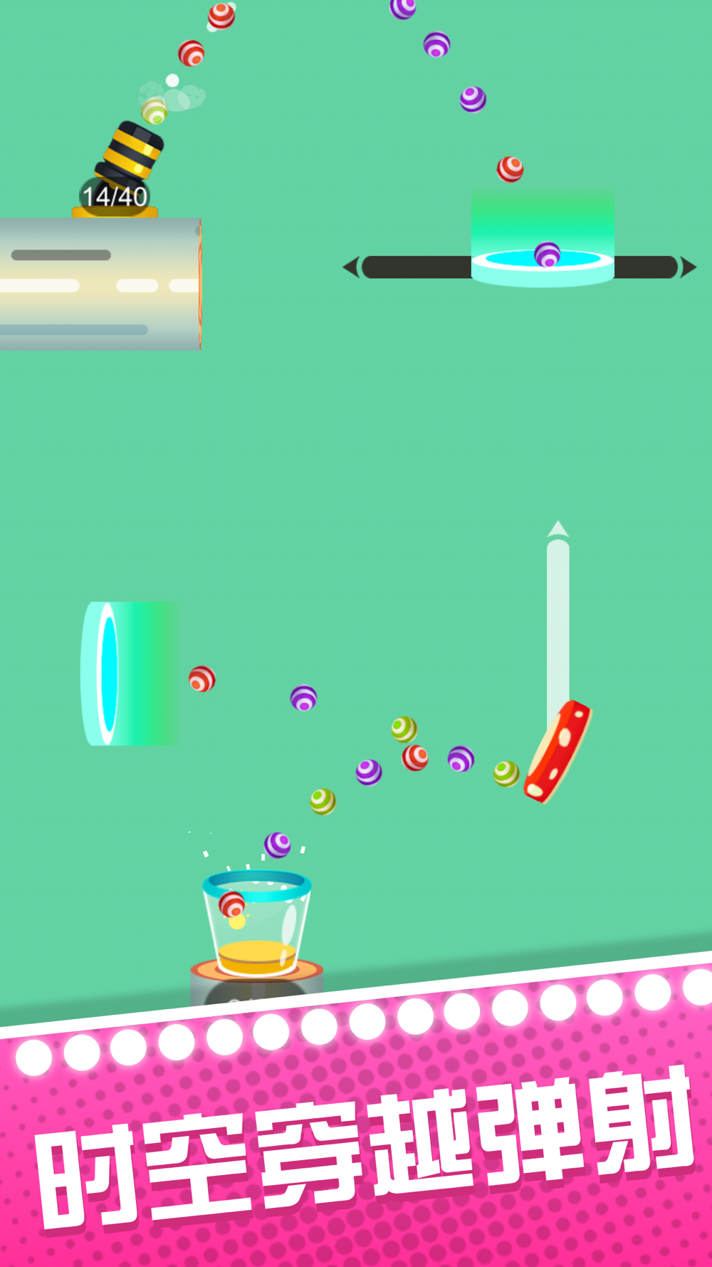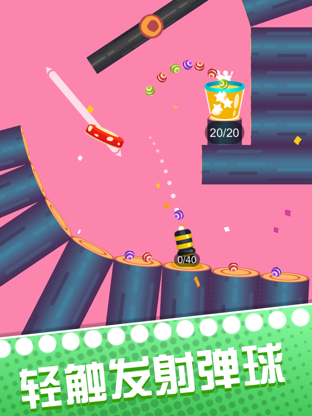 轻点屏幕使弹球射出,调整弹板改变球球路径,成功将弹球落到杯中!