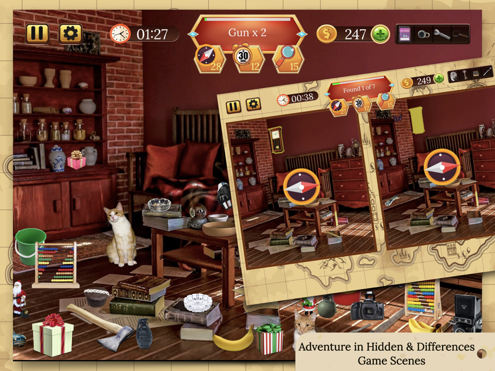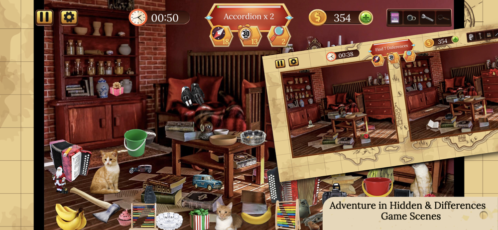 Relax your mind with a combination of hidden objects games and find 7 differences games everywhere, every time.