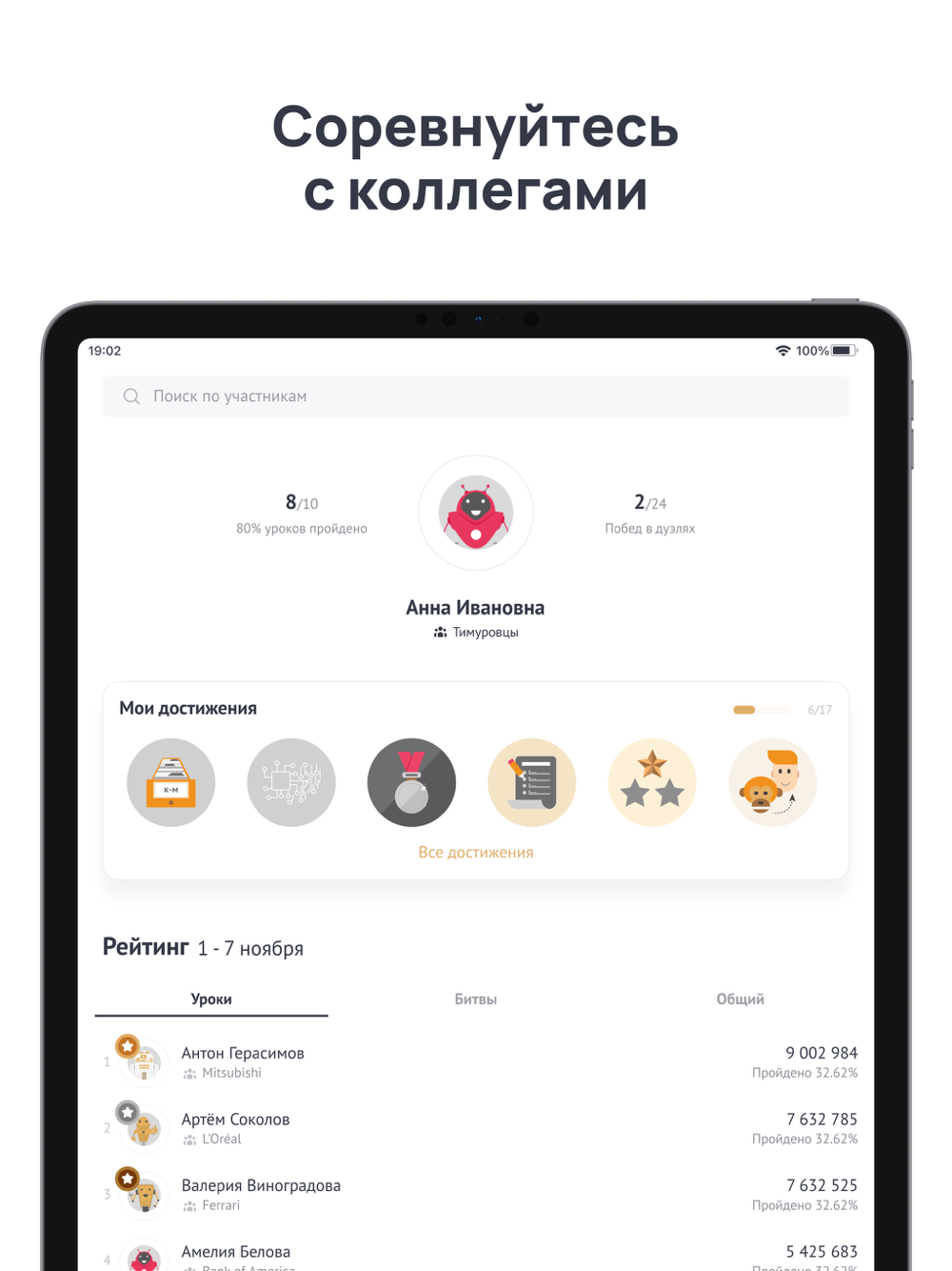 Программа обучения подстраивается под каждого пользователя. Прокачивайте свой уровень от цифрового австралопитека до человека будущего и соревнуйтесь с коллегами.