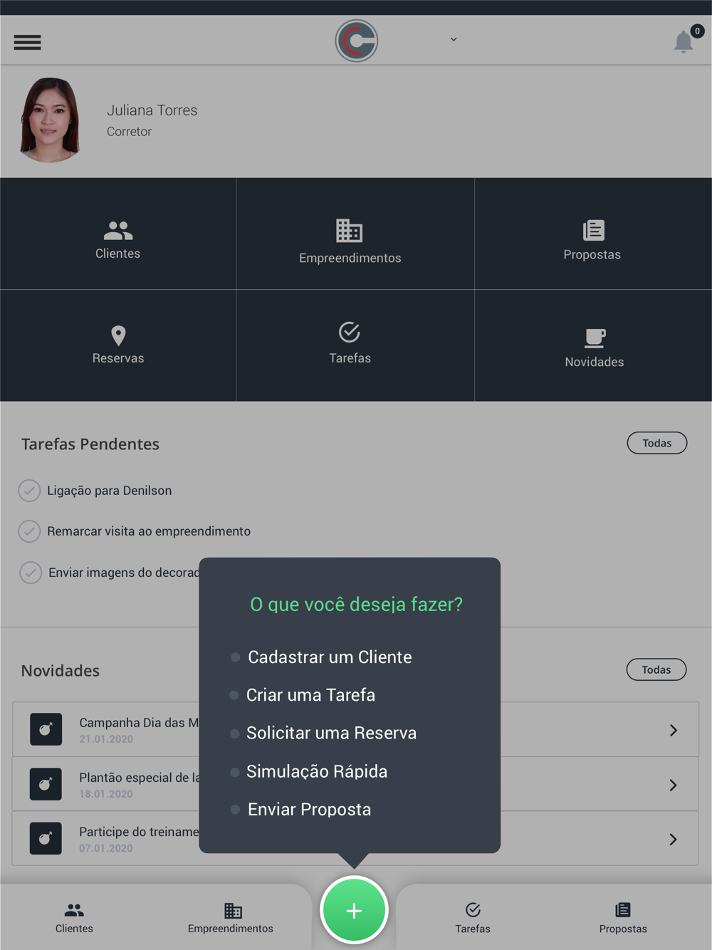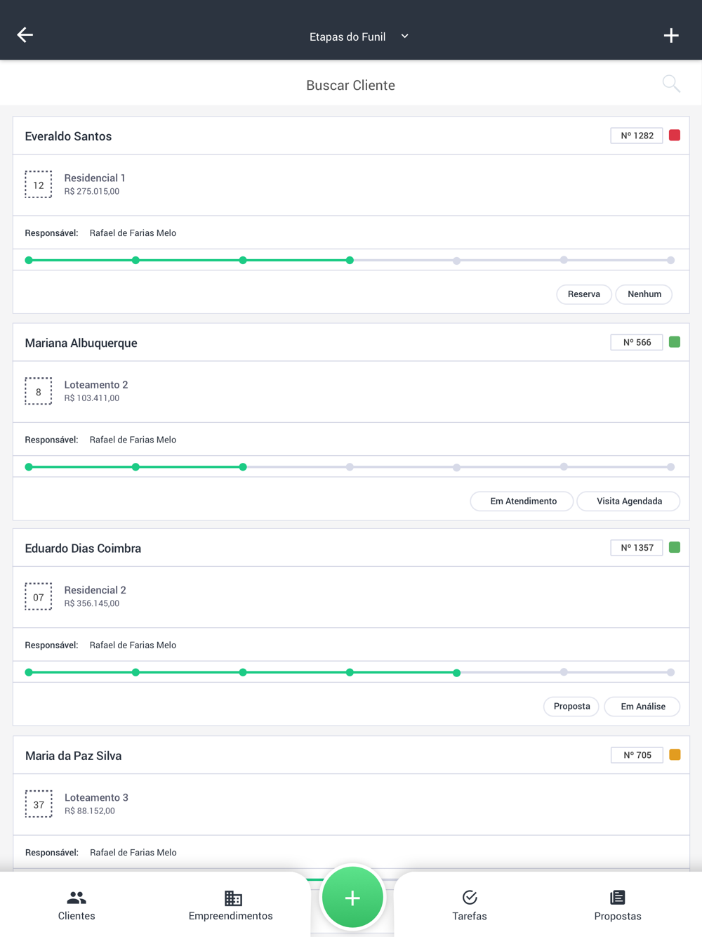 Faça todo o processo de vendas pelo aplicativo, envio de propostas, reserva de unidades, gestão de atendimentos. Através do funil de vendas é possível visualizar e organizar todos os negócios em andamento em cada etapa da venda.