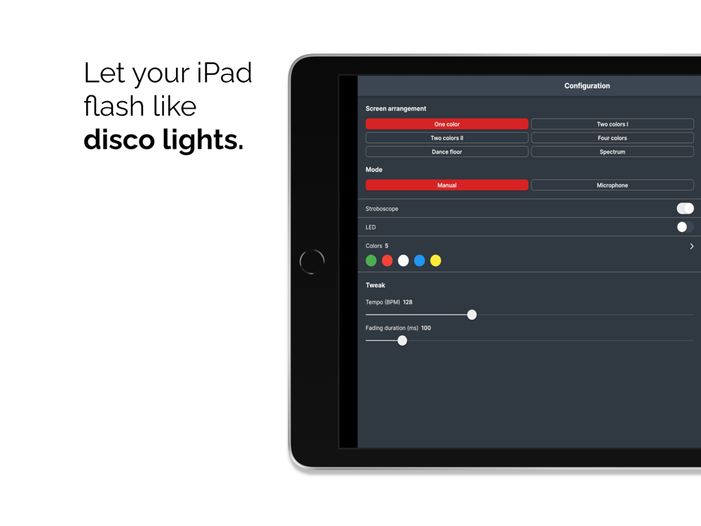 How to start the lightshow? It’s very simple, add color to the list. Add as many colors you like. You can set the order of every color in the list. When you are done, press the play button. The lightshow will start. The phone will be switching the color of the light, simulating the strobe disco lights. Just enjoy listening to the music during your rave!