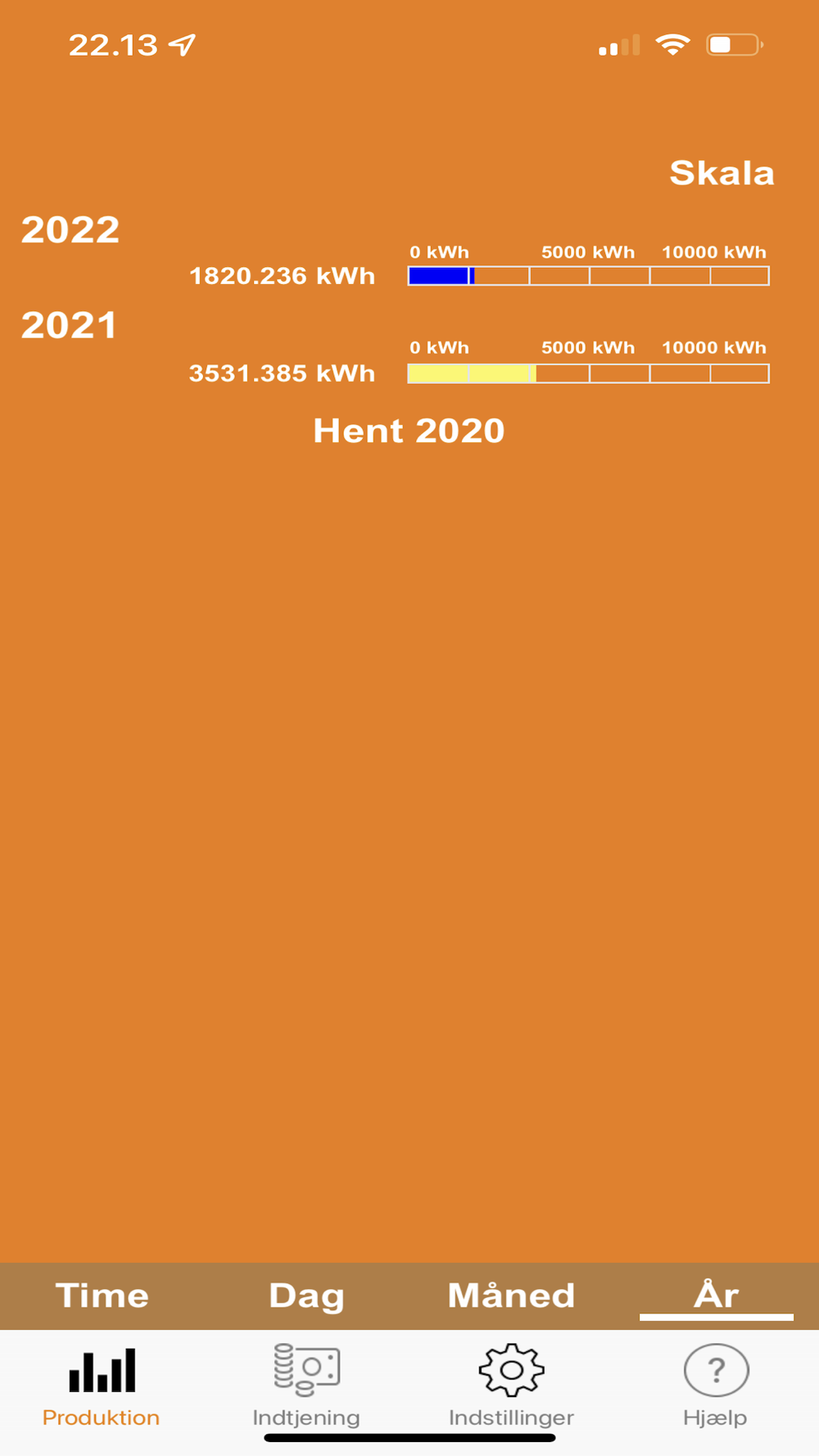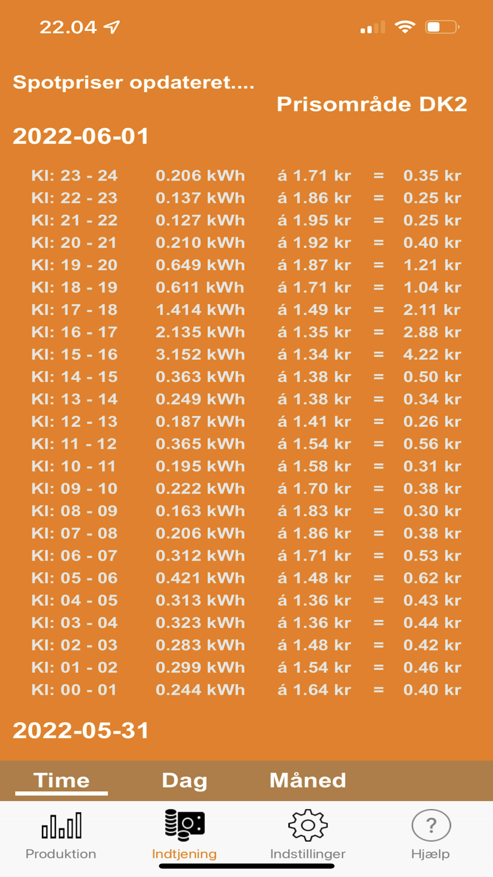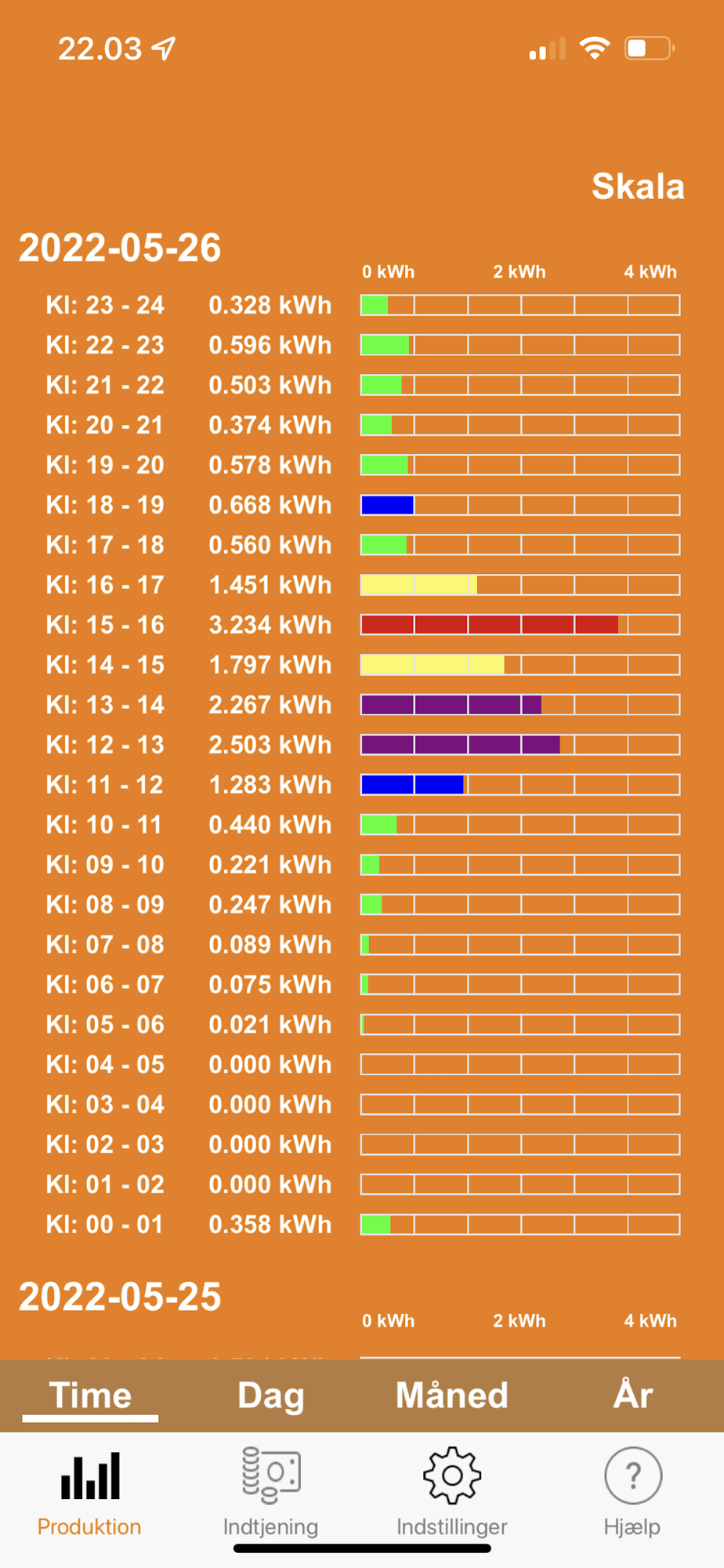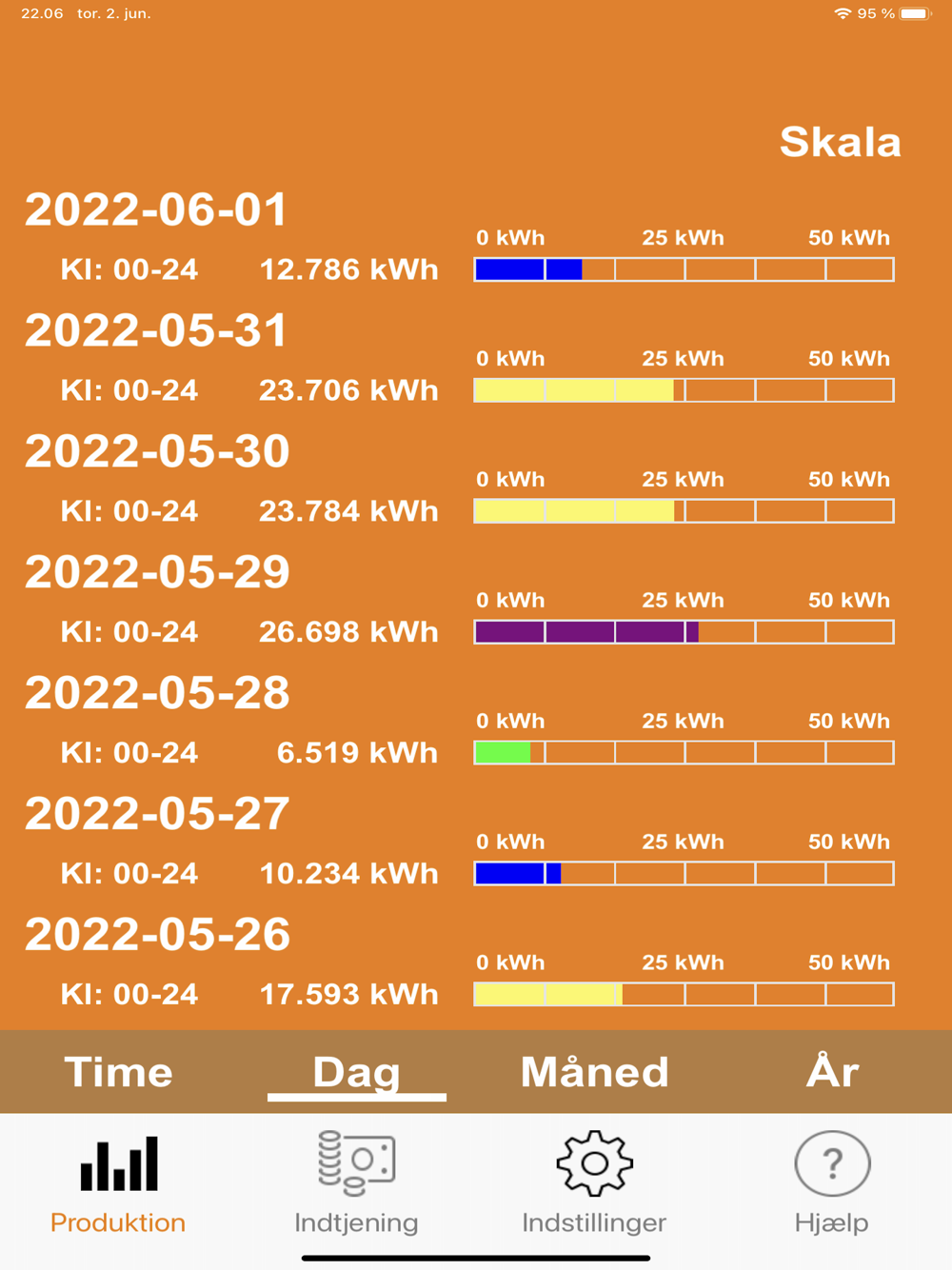 Du kan du se din produktion i kWh og indtjening i kr per dag, måned eller år op til 4 år tilbage i tiden.