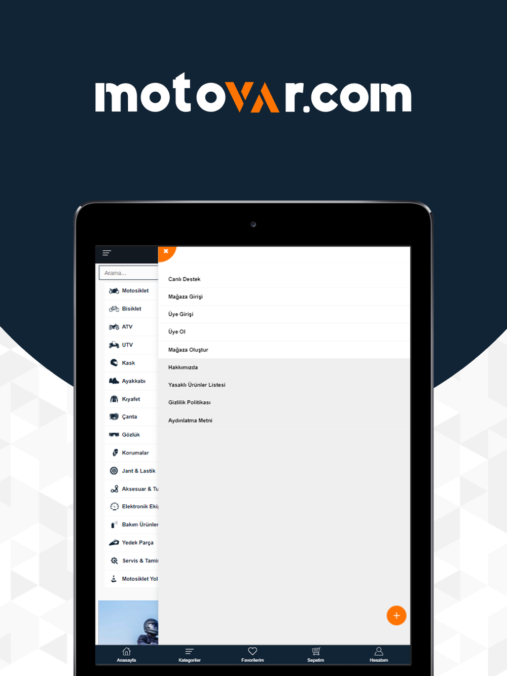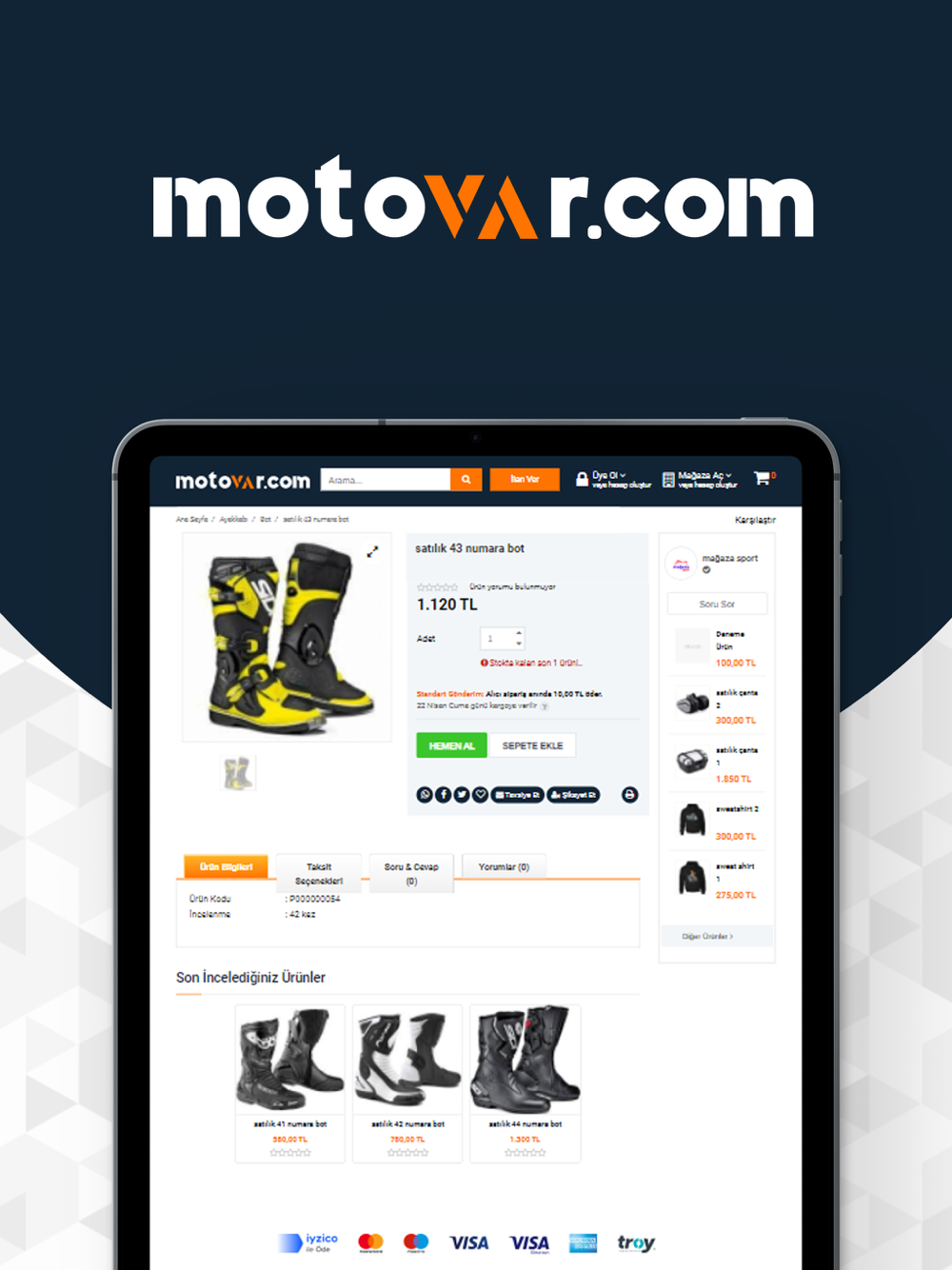 Motosiklet,bisiklet, Atv, Utv, kiralık motosiklet ve bunların yedek parçalarını,bakım ürünlerini,elektronik ekipmanlarını,aksesuarlarını,jant-lastik,korumalar,gözlük,çanta,kıyafet,ayakkabı,kask,yol yardımı,servis&tamir&bakım gibi hayatınızı kolaylaştıracak bir çok kategoride hizmet vermekte olan motovar.com en iyi hizmeti teknoloji ile birleştirerek sizlere sunmaktadır.