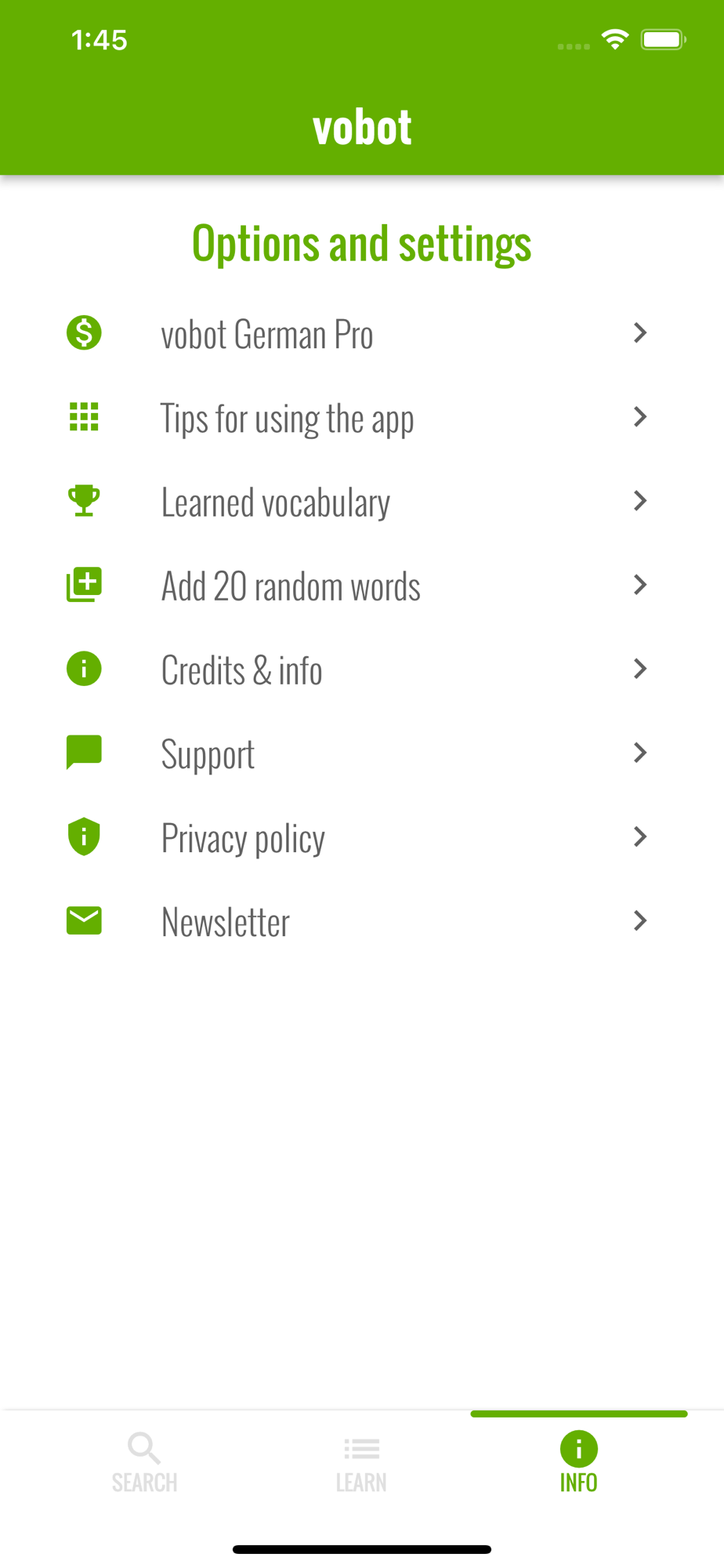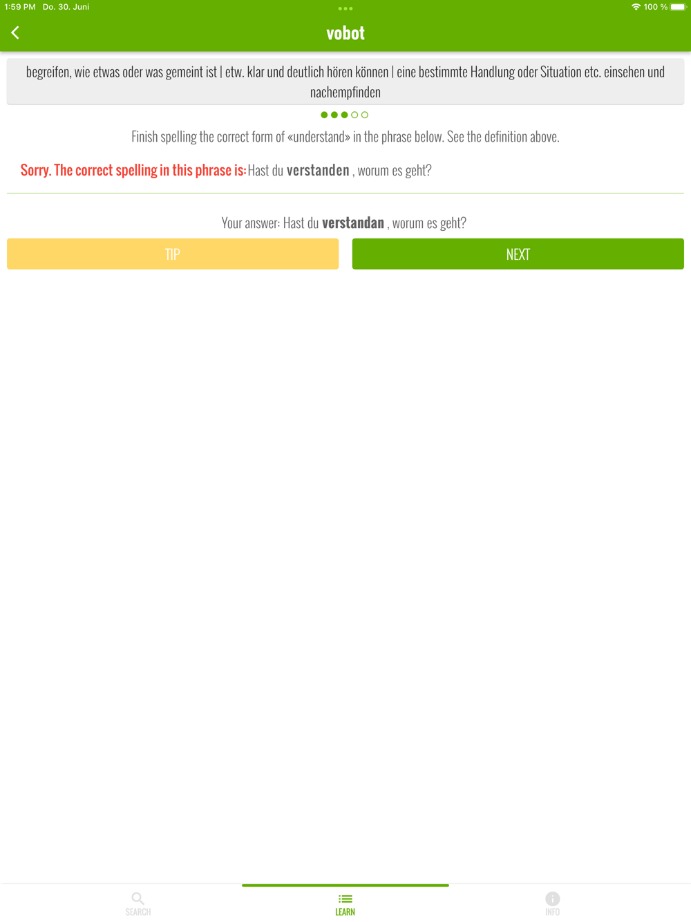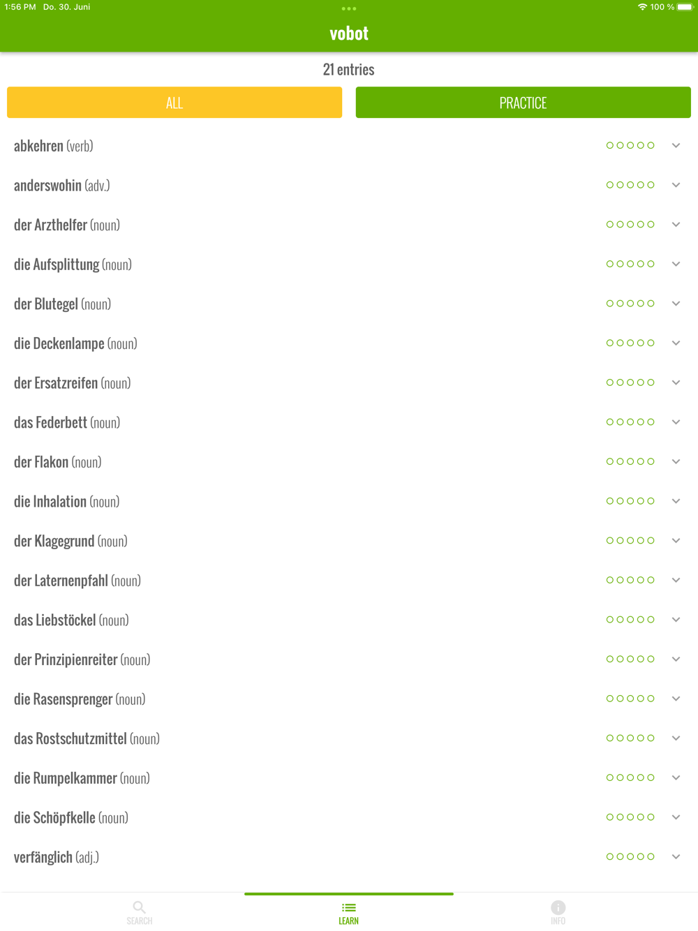 The free version allows you to search for any German word or expression beginning with the letter "v". Upgrade to "vobot German Pro" to search the whole dictionary in German or English.