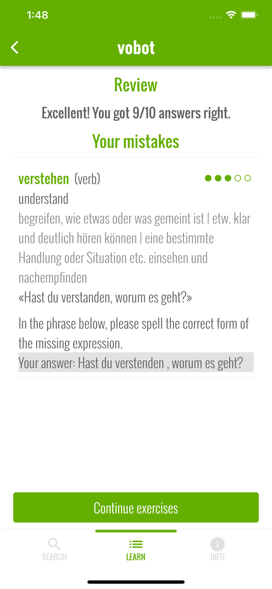 vobot is a full dictionary combined with a vocabulary trainer app to help you learn German as a foreign language. It gives you translations as well as sample phrases, so you can see how a word or expression is used in a typical context. Click the heart next to a sample sentence to add it to your learning list. Then practice your chosen vocabulary in a series of progressively difficult exercises for more efficient long-term uptake.