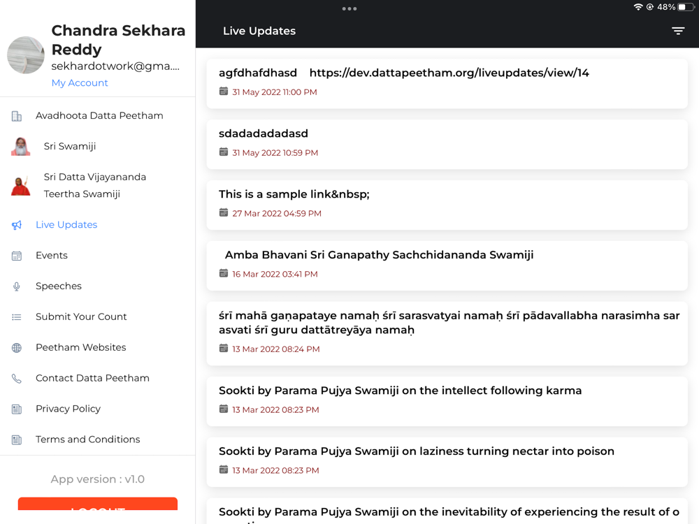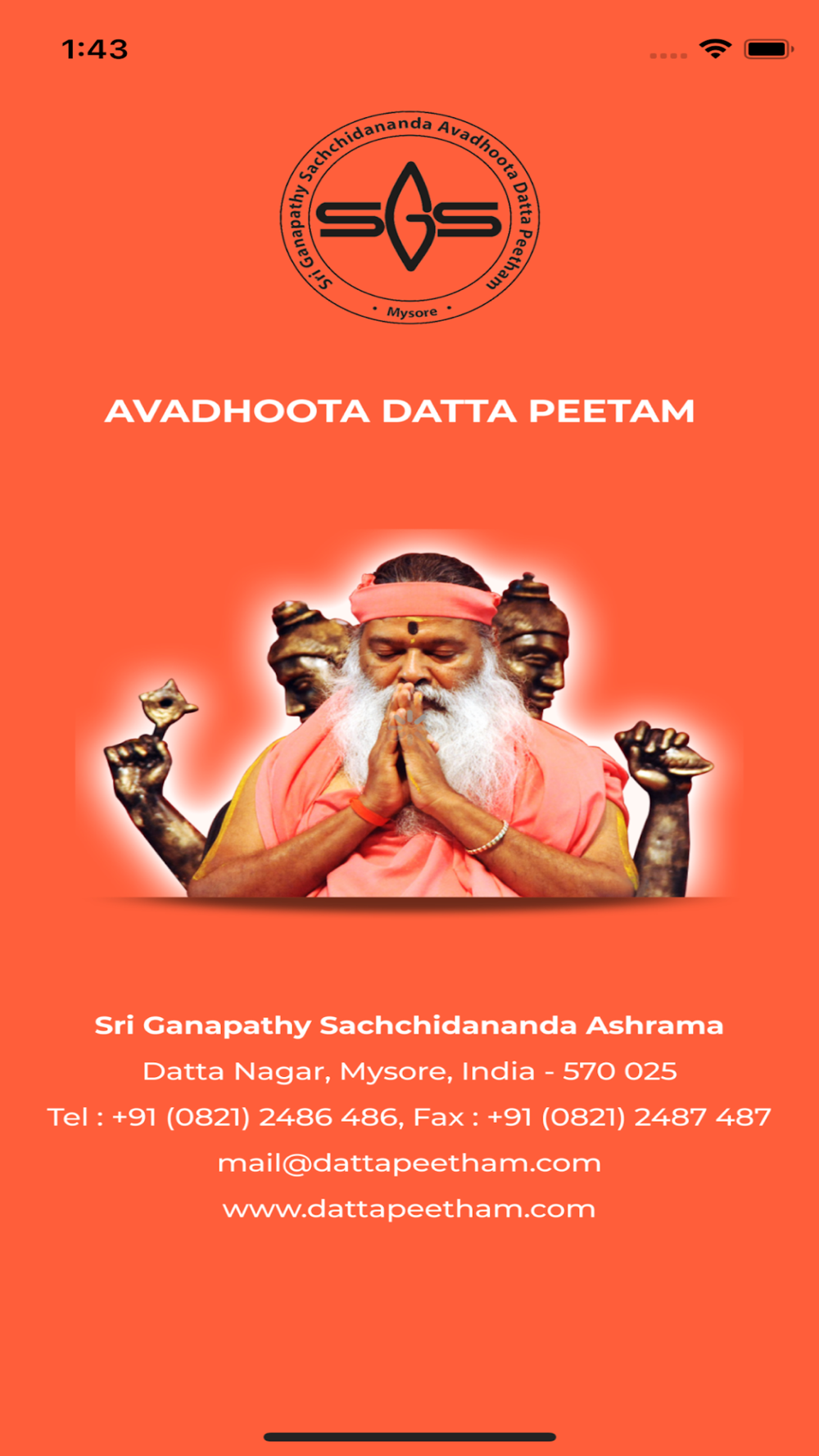 Avadhoota Datta Peetham popularly called as Sri Ganapathy Sachchidananda Ashram is situated on a sprawling 40-acre site at the foot of Chamundi Hill, in the Royal City of Mysore, State of Karnataka in Southern India. This is the head quarters of Pujya Swamiji's mission. Datta Peetham has grown over years to an impressive stature and encompasses many aspects of the spiritual life. Here one can study Yoga, the Vedas and Sanskrit, bhajans, music. There is a Universal Prayer Hall where traditional Pujas and Homas are performed. As Sri Swamiji propagates the teaching of Dattatreya Avadhoota, a Datta Temple has been constructed. Dattatreya the eternal teacher, is the Manifestation of the Triple Principle of Sat (Existence), Chit (Knowledge) and Ananda (Bliss).