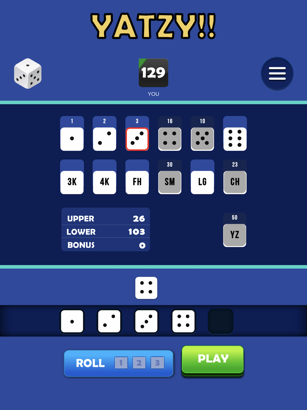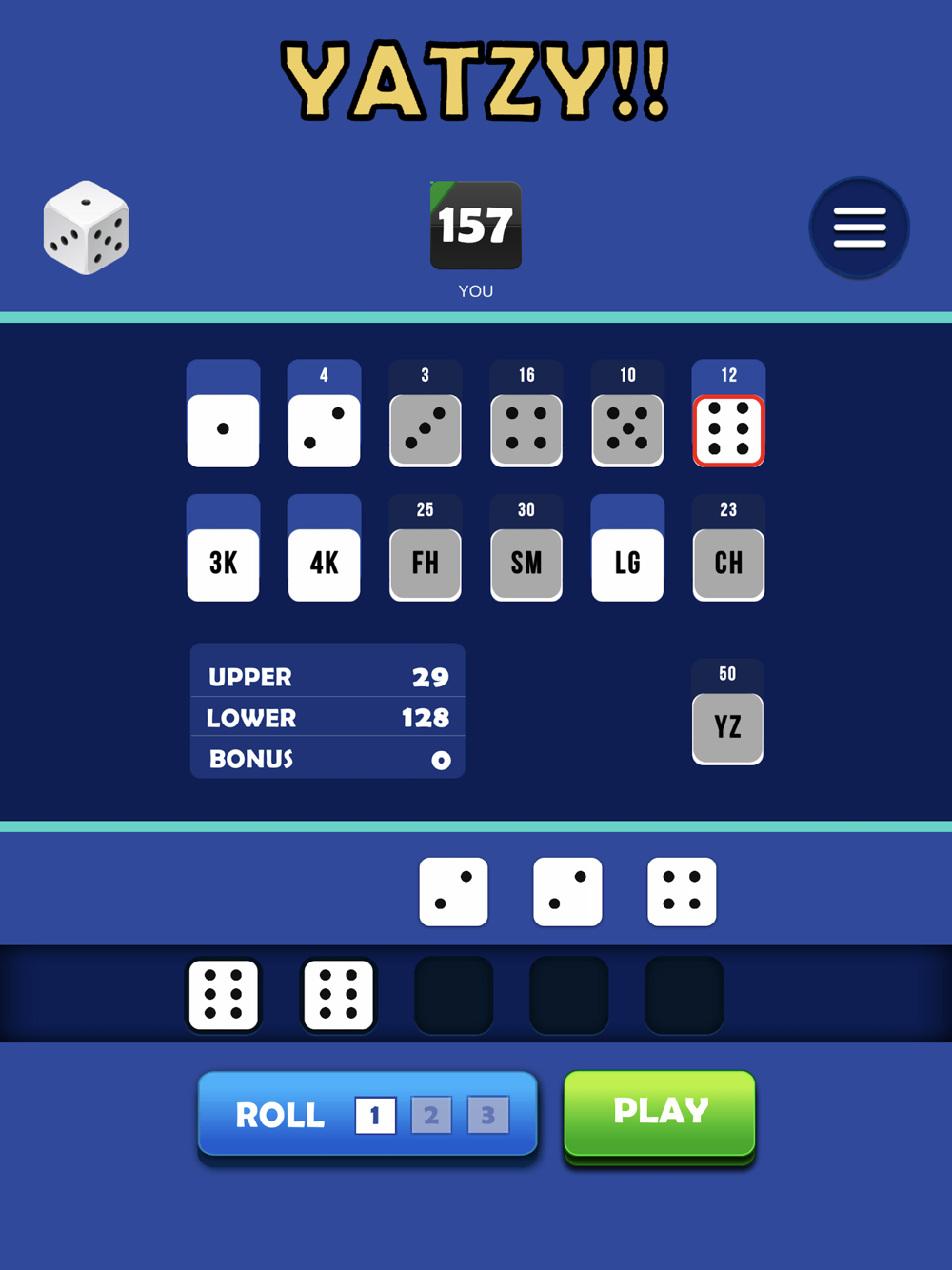 A game of Yatzy!! - Classic Dice Game consists of 13 rounds. In each round, you roll the dice and score the result in one of 13 categories.You must score exactly once in each category, so skill and judgment are required as the game progresses and your options start to run out. The aim of the game is to make the biggest score you can from the 13 rounds.