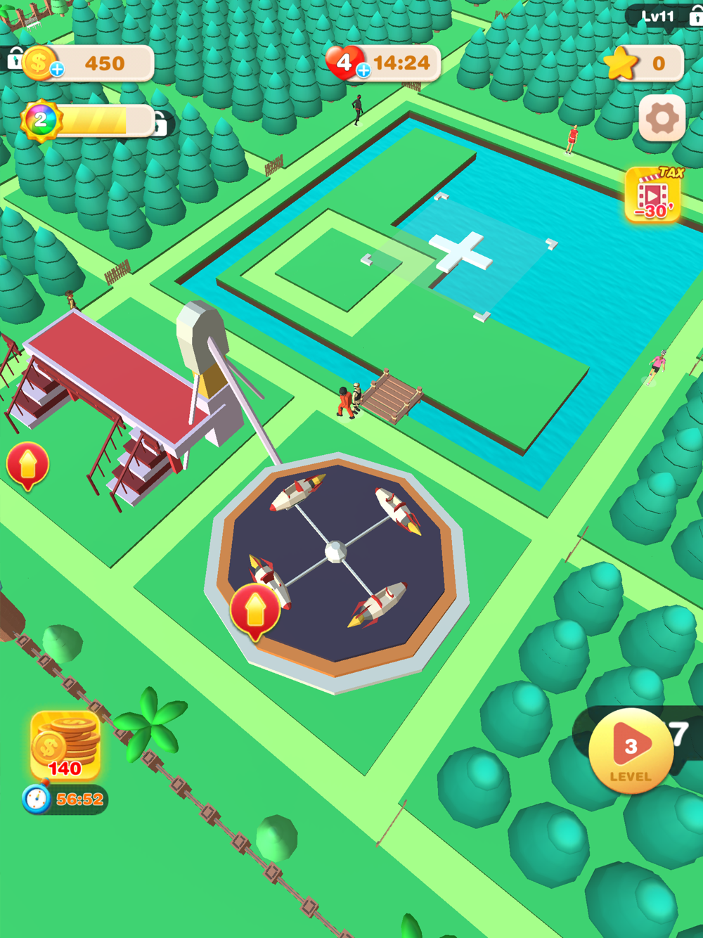 What would an amusement park look like in your mind? It's got carousels, pirate ships, pendulums, roller coasters, vaudeville, yeah. But here, it's all yours. You can build whatever facilities you want and collect taxes. The more rides are built, the more taxes are collected. You can play through small games to earn stars and coins and build your own playground.