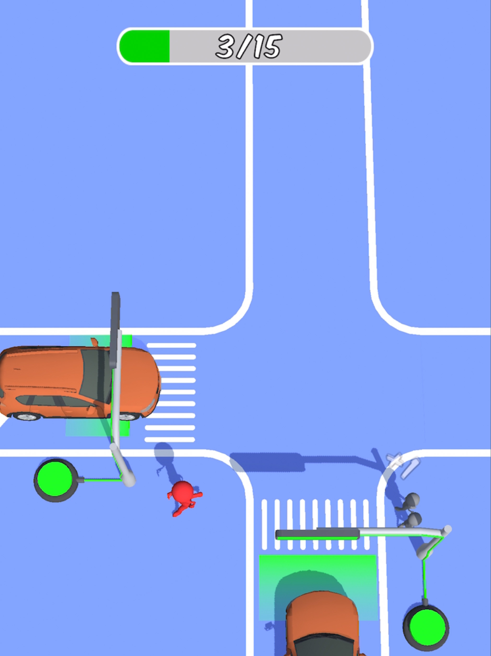 Walk on the traffic light buttons to toggle them green & red. Let no pedestrian get hit & no cars crashed!