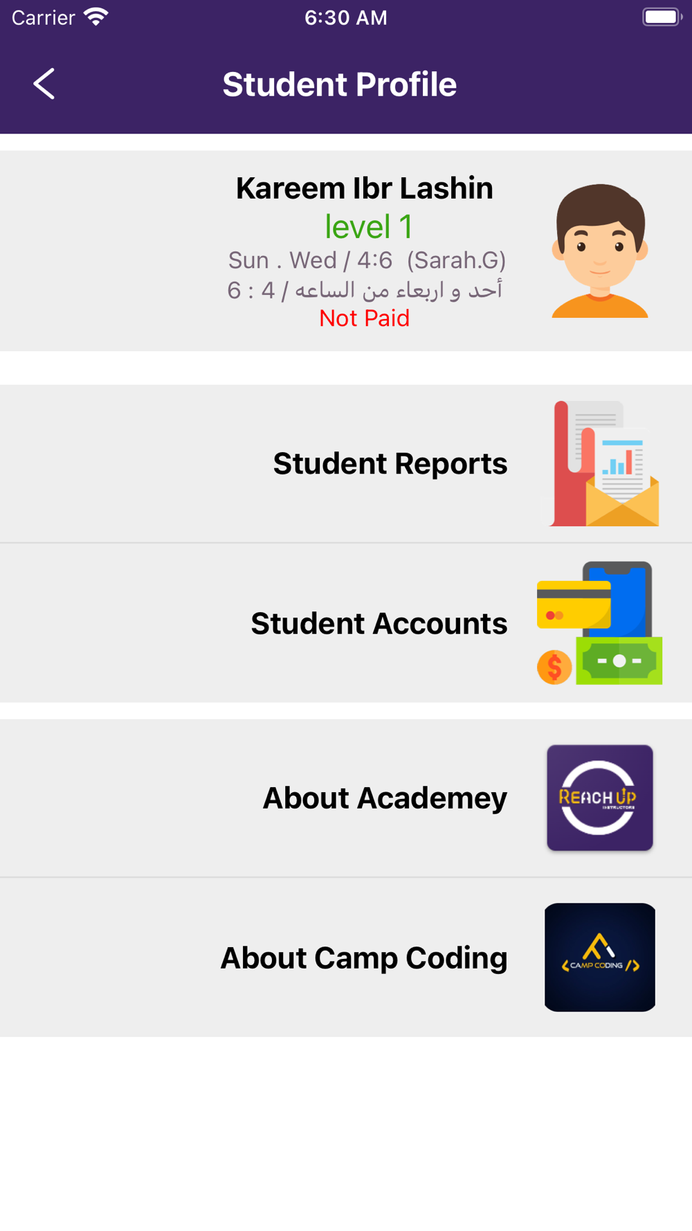 Reach up app provides for all our parents &students: daily follow up, reports and evaluation.