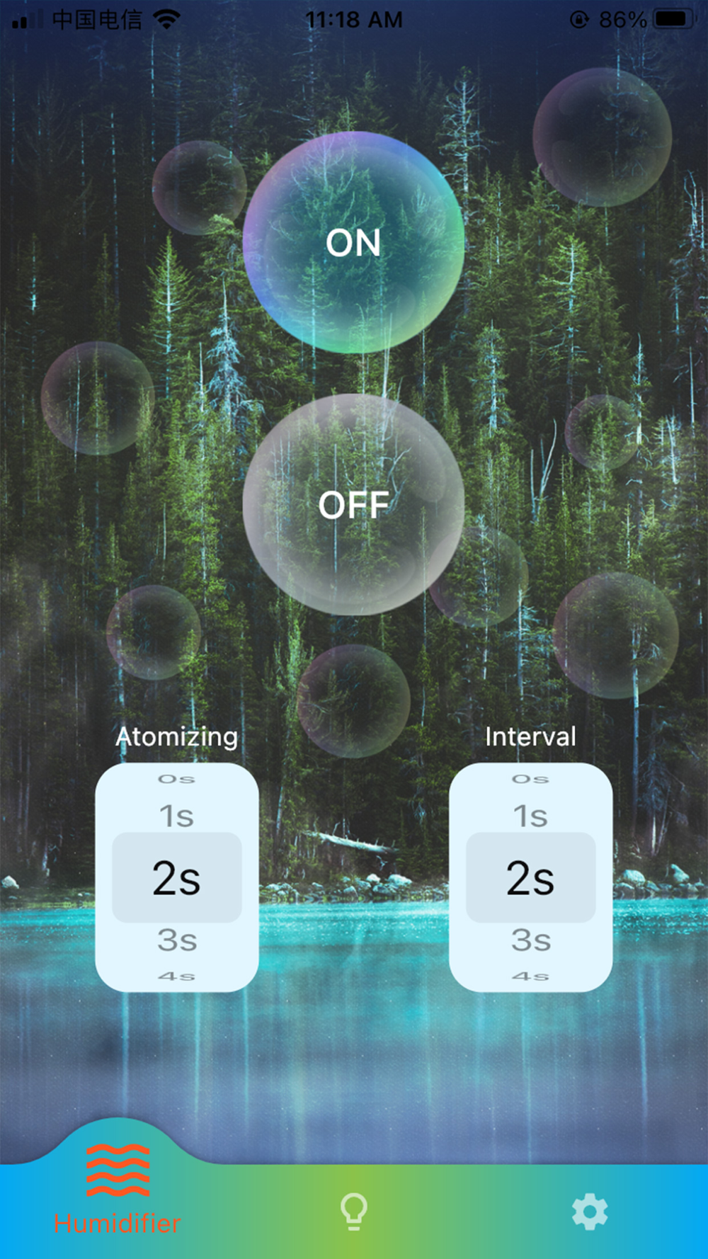 This App is used to control the switch of the humidifier, adjust the spray and the interval time, and at the same time, you can set the display mode of its light, so that the spray can show colorful effects under the illumination of the light.