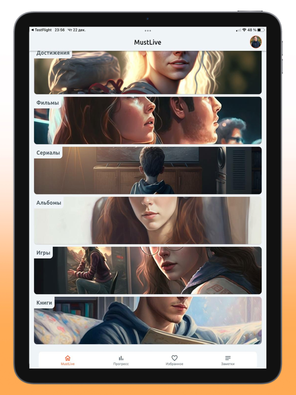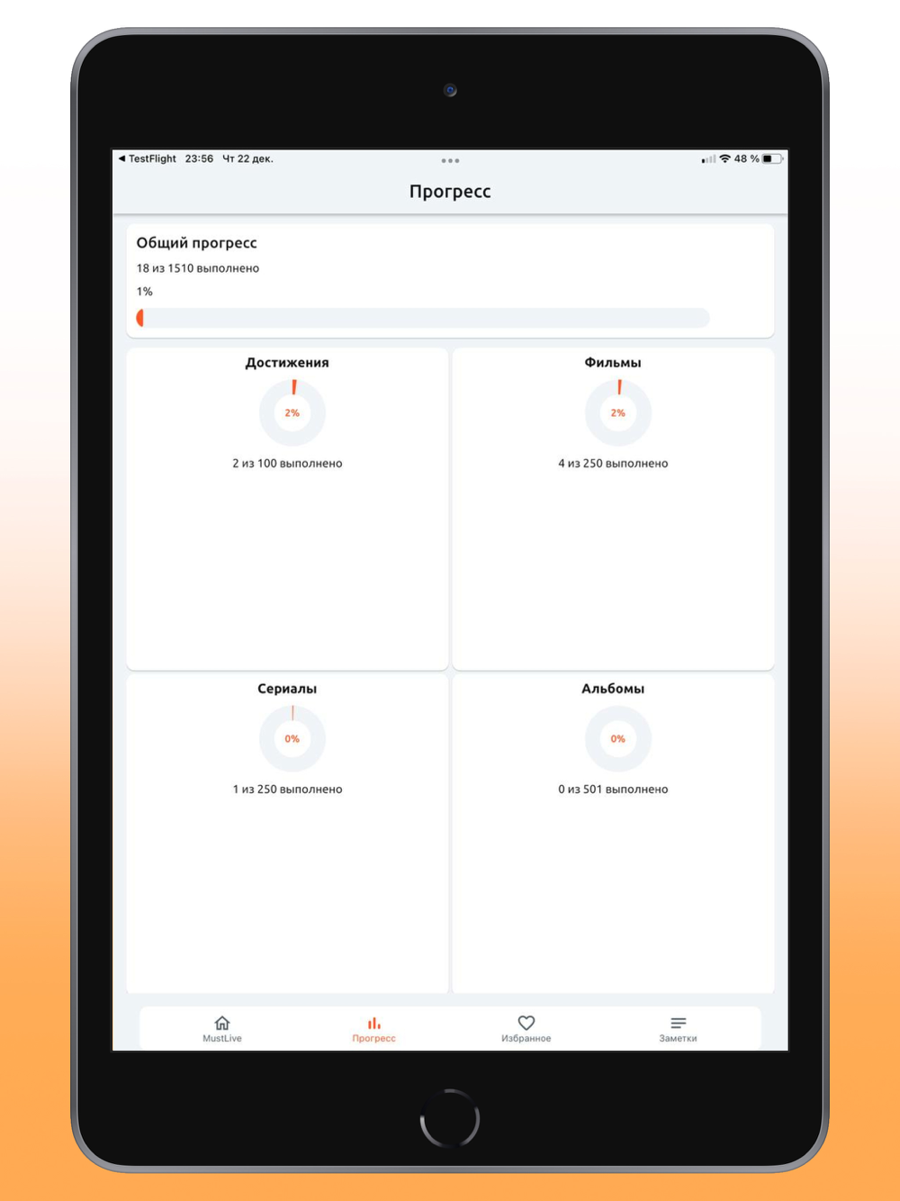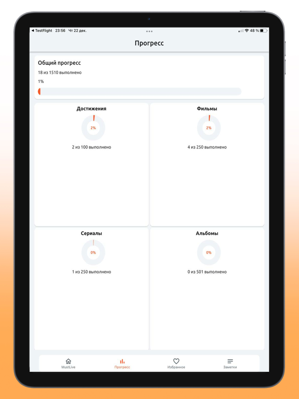 Смотрите культовые фильмы, читайте нетленные произведения, играйте в легендарные игры. Отмечайте каждое выполненное действие. Добавляйте фото и комментарии. Заполняйте шкалу прогресса. Не упустите ни одного момента в своей жизни.