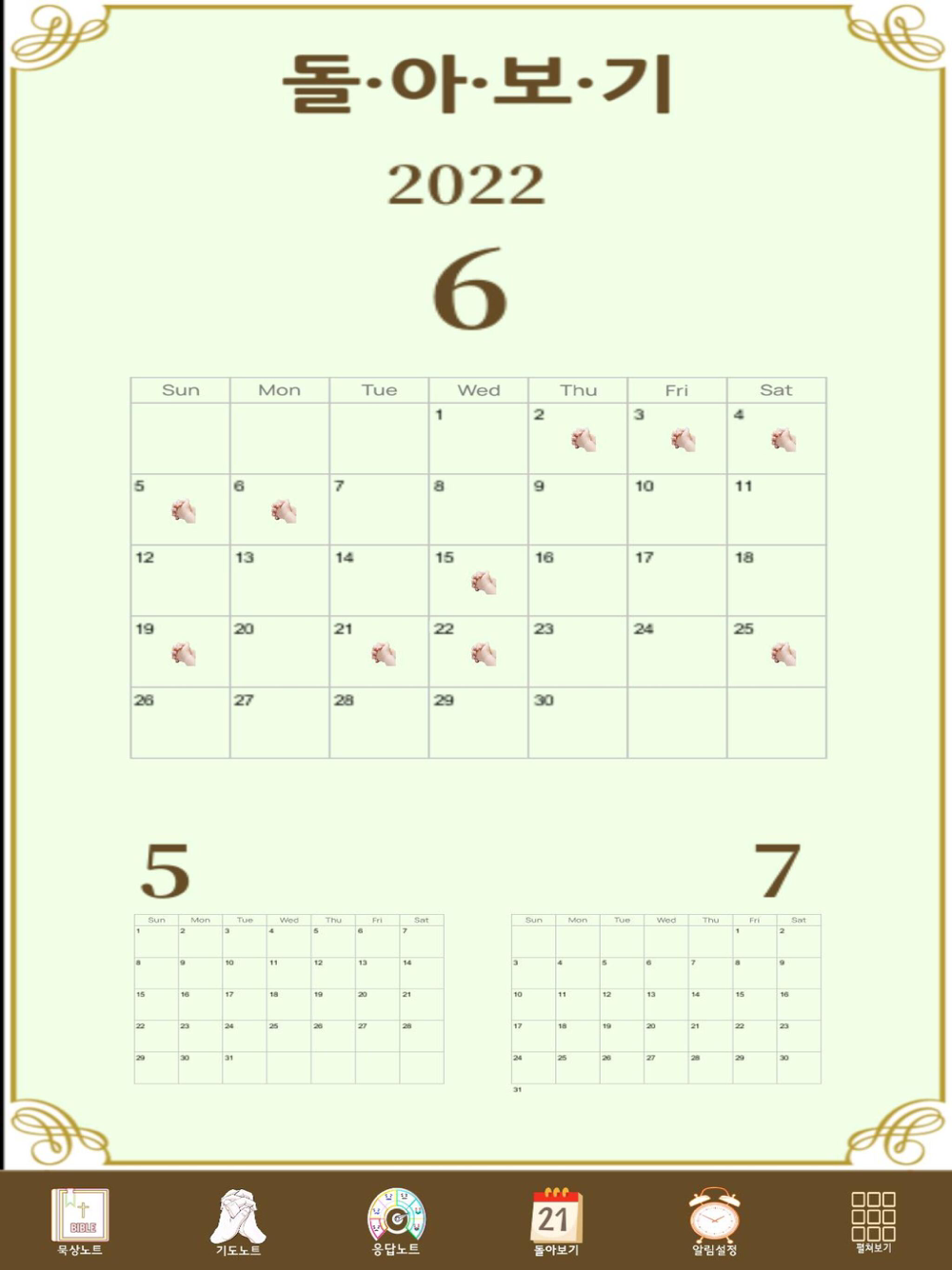 6. 돌아보기 캘린더 – 상단에는 당 월의 캘린더가 있고, 하단은 지난 달과 다음 달의 캘린더가 있습니다. 당 월에서 지난 날에 기도 내용을 확인하려 하면 해당 날짜를 클릭하면 저장된 기도 내용을 확인할 수 있습니다. 지난 달의 내용을 확인하려면 하단의 지난 달을 클릭하면 지난 달이 상단으로 올라오며 해당 날짜를 클릭하여 확인 할 수 있습니다. 캘린더에는 기도했던 날이 + 로 표시되어 있습니다. 기도 내용이 없는 날을 클릭하면 “기도 내용이 없습니다. 확인해 주십시오”라는 팝업 창이 뜹니다. 확인을 클릭하면 다시 캘린더로 돌아갑니다.