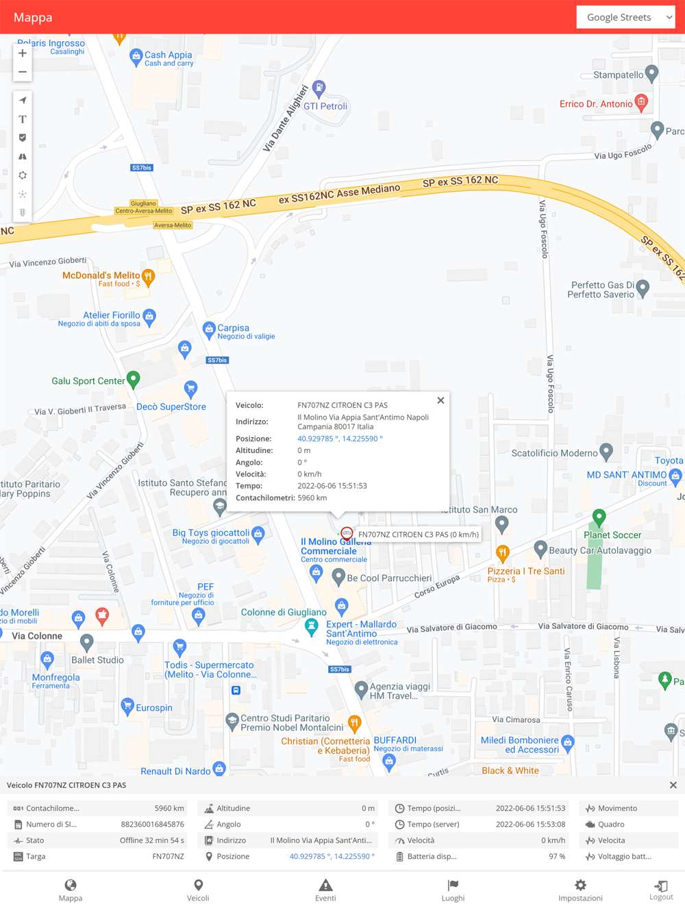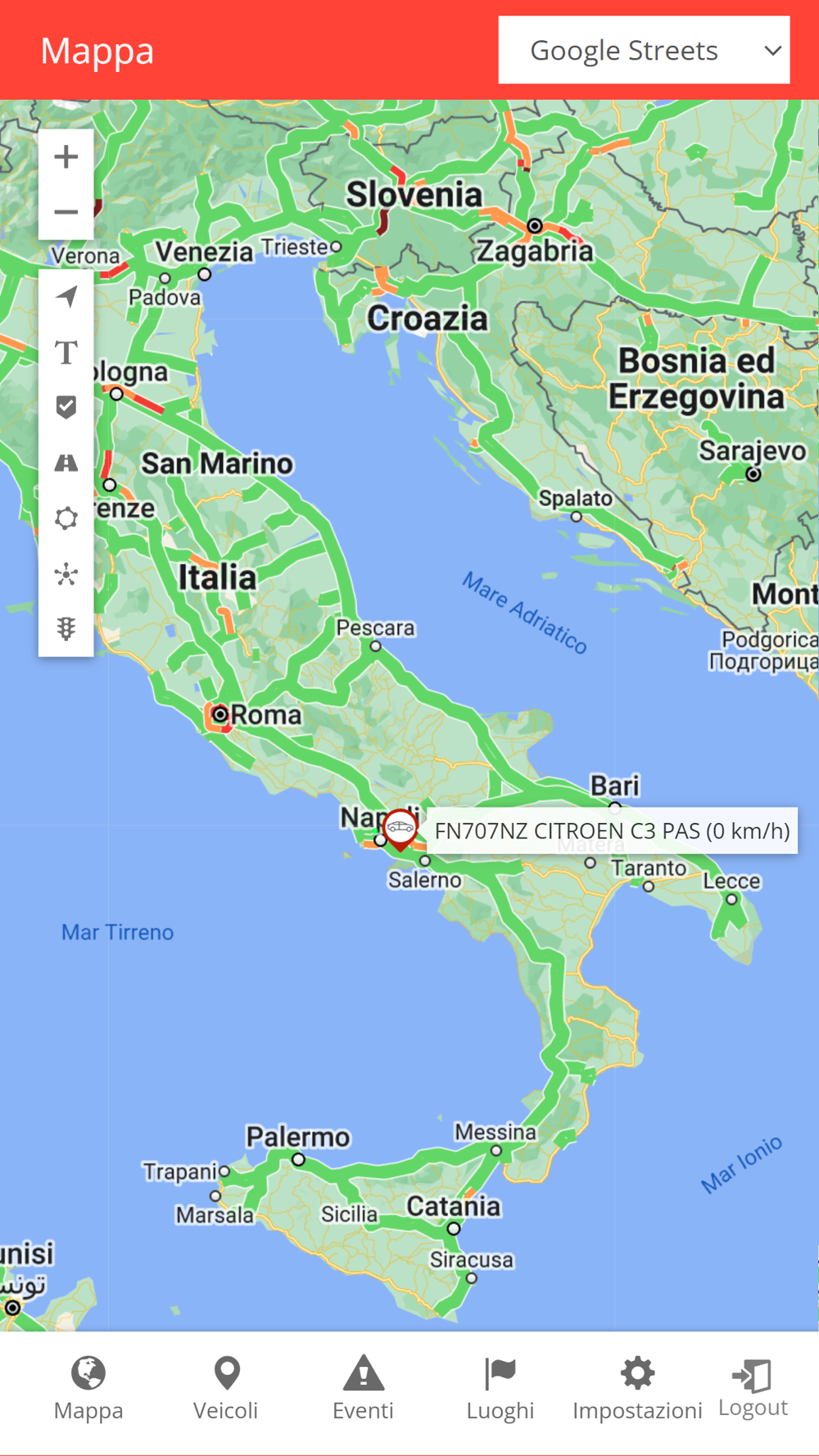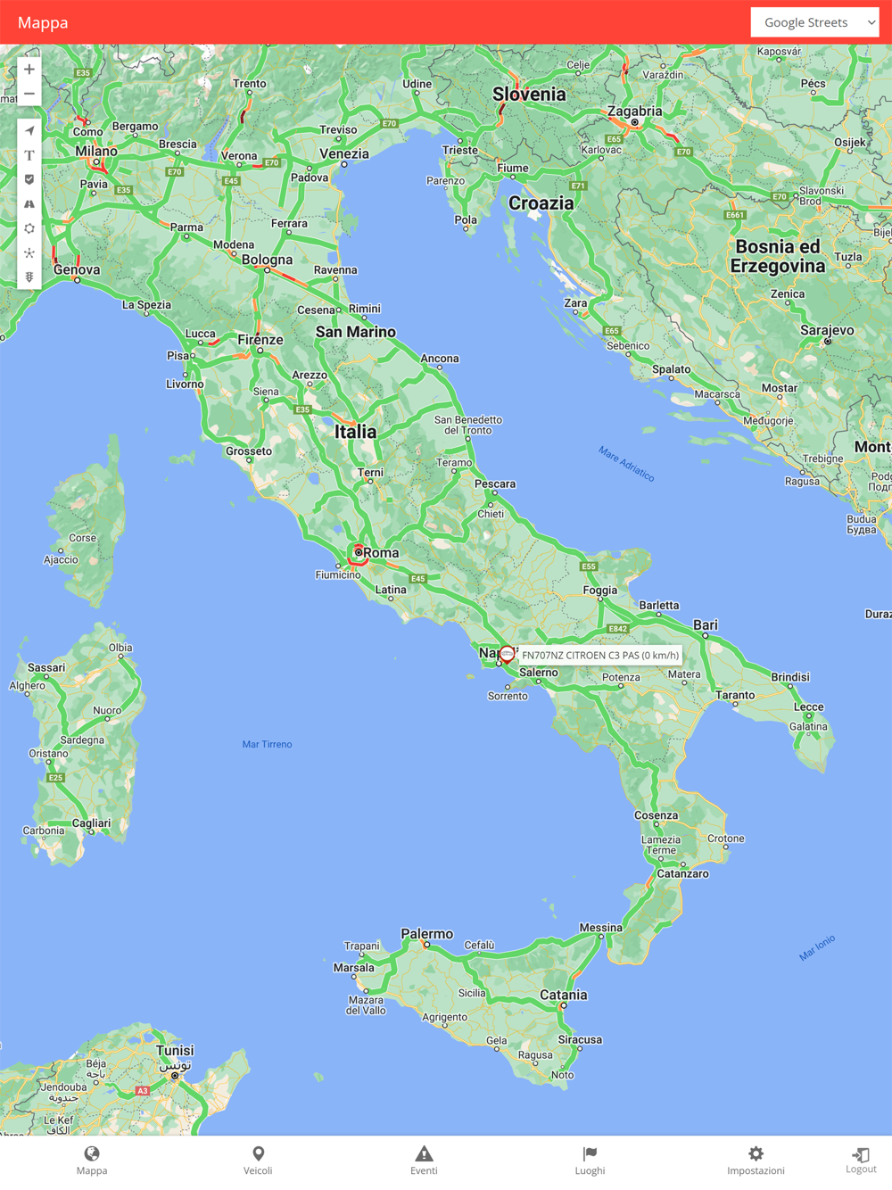 Visualizzazione su mappa fotografica e cartografica della flotta e degli spostamenti.