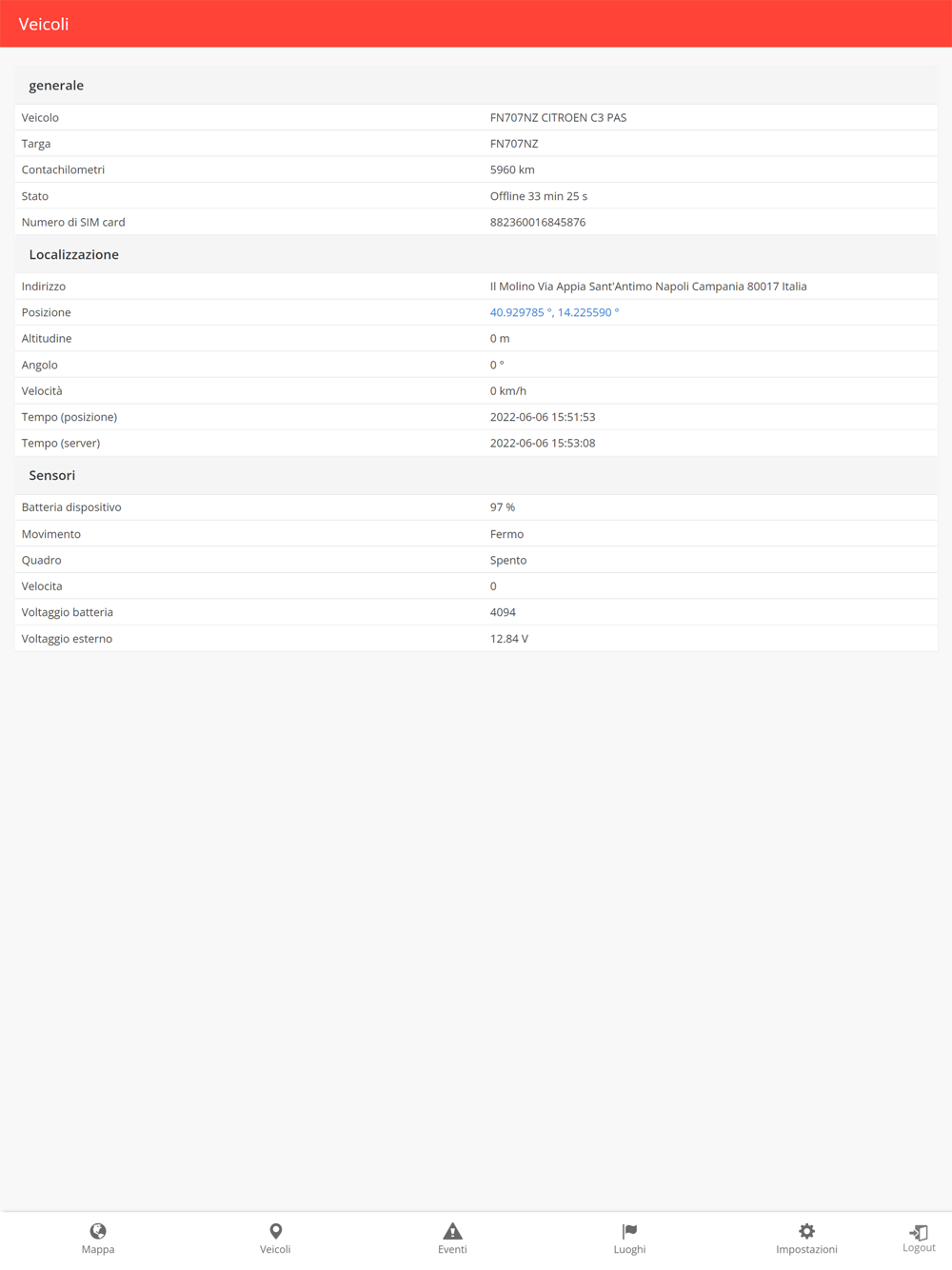 Rilevazione dello stato del quadro on/off con data ora posizione.