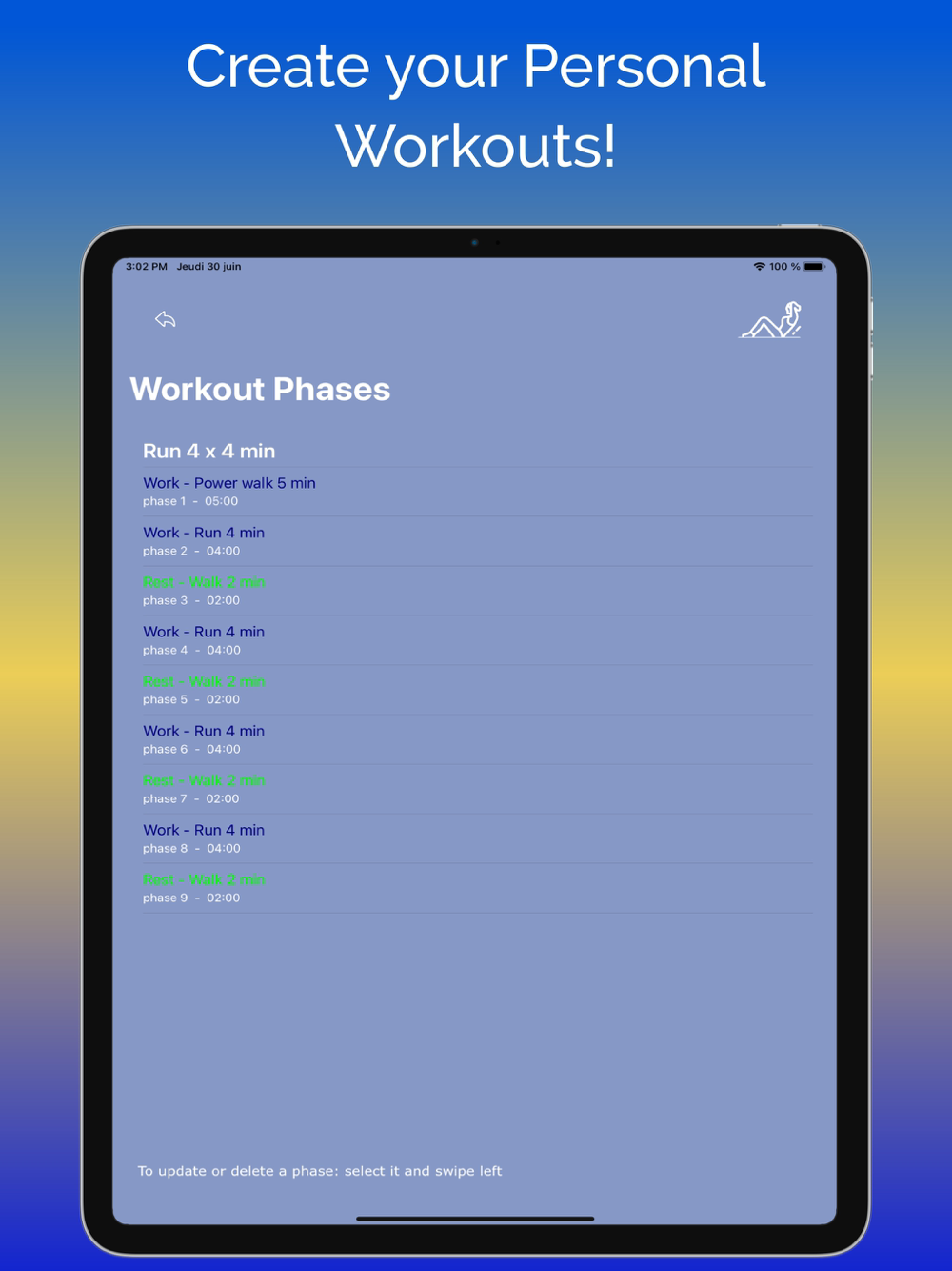 Enjoy the app with handy features to coach you through the workout: reading out the exercise name or motivation messages you can add, intervals announced 30 sec before they start, half-time alert, next phase displayed, vibration mode.