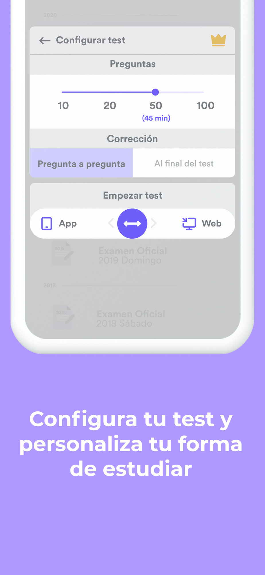 ● Personalización de test por temas, bloques, exámenes oficiales, modo libre, según tus preferencias.