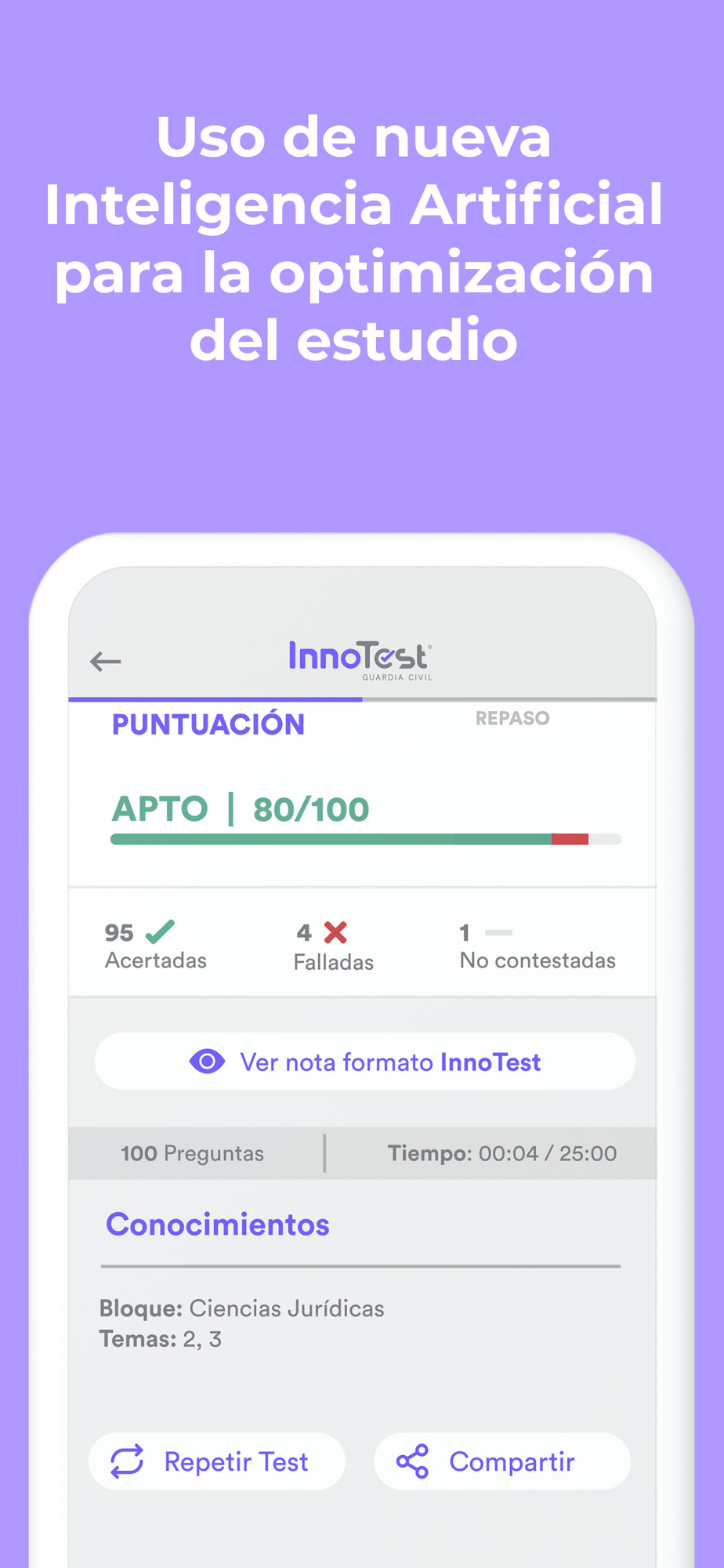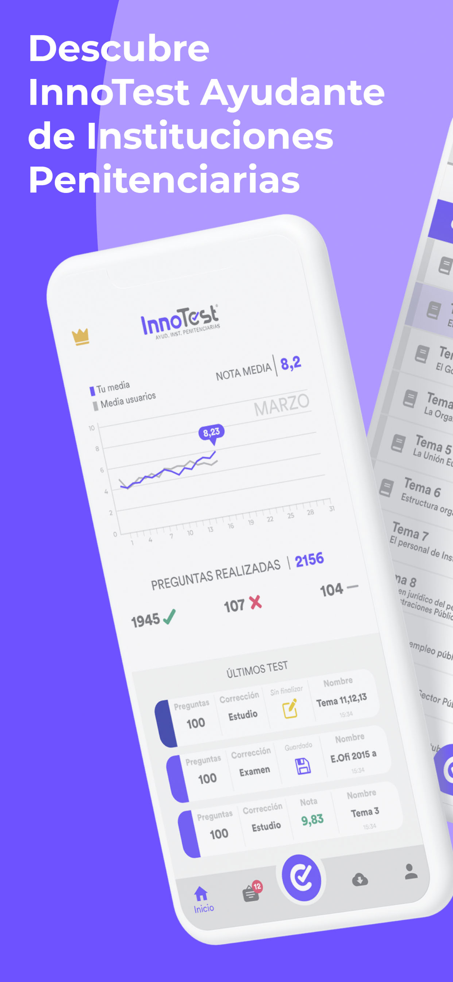 Desarrollada sobre Inteligencia Artificial y Big Data, la tecnología de InnoTest te permitirá optimizar tu esfuerzo mientras nuestro algoritmo aprende de ti y otros miles de opositores en tiempo real para acercarte más a tu aprobado. La más completa e innovadora APP de preparación de oposiciones del mercado donde encontrarás los mejores test al Cuerpo de Ayudantes de Instituciones Penitenciarias.