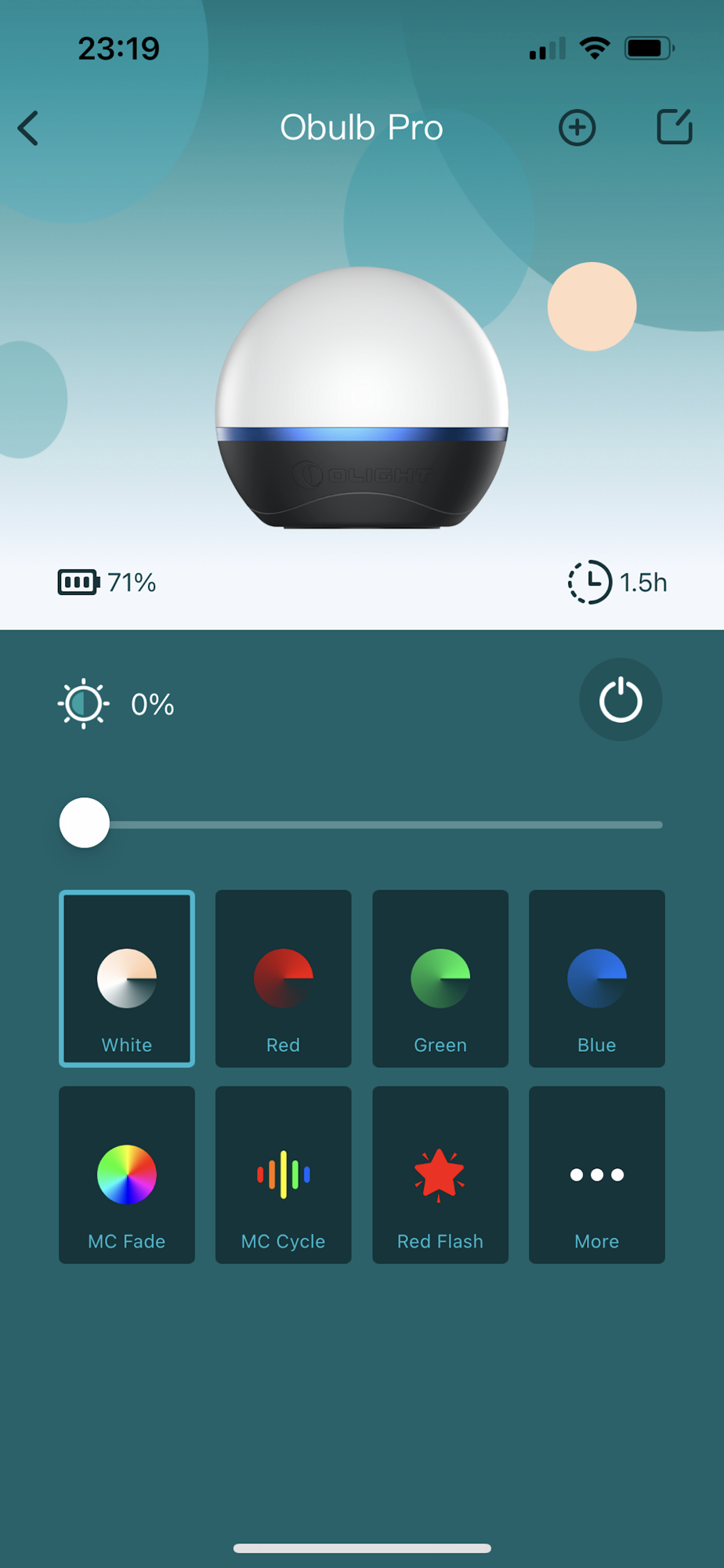 1. Bluetooth Connection: Able to search and connect compatible Olight devices by using the Bluetooth function of a mobile phone. Once the connection succeeds, it adds the devices to an ad-hoc network.