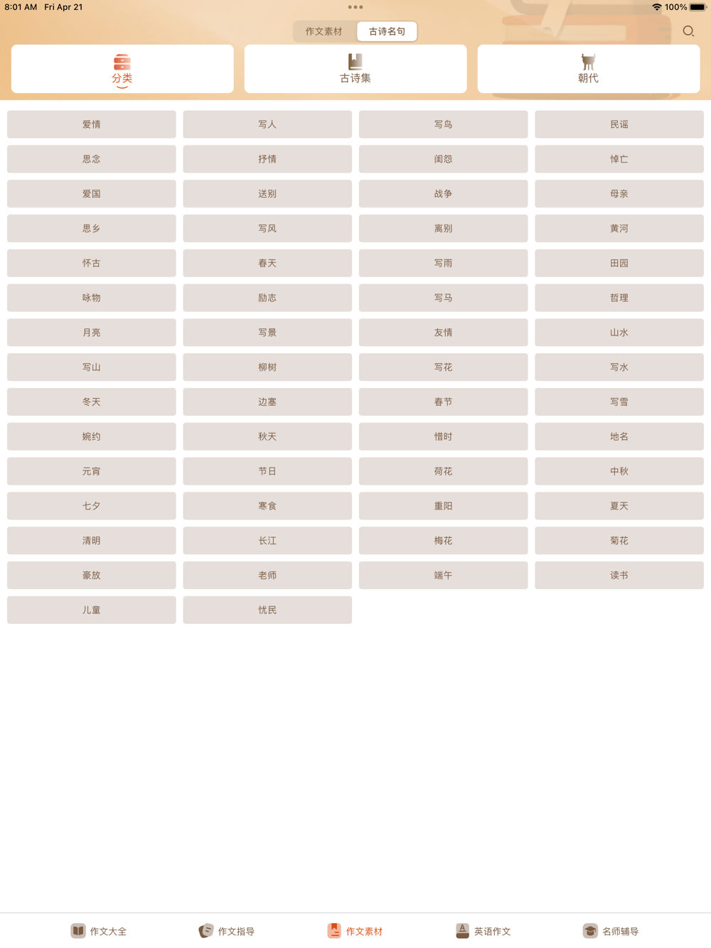 AI作文大全包括了五大模块:作文大全、作文指导、作文素材、古诗名句、英语作文和名师辅导。每个模块都有海量的作文和作文素材,是您学习写作的必备神器。
