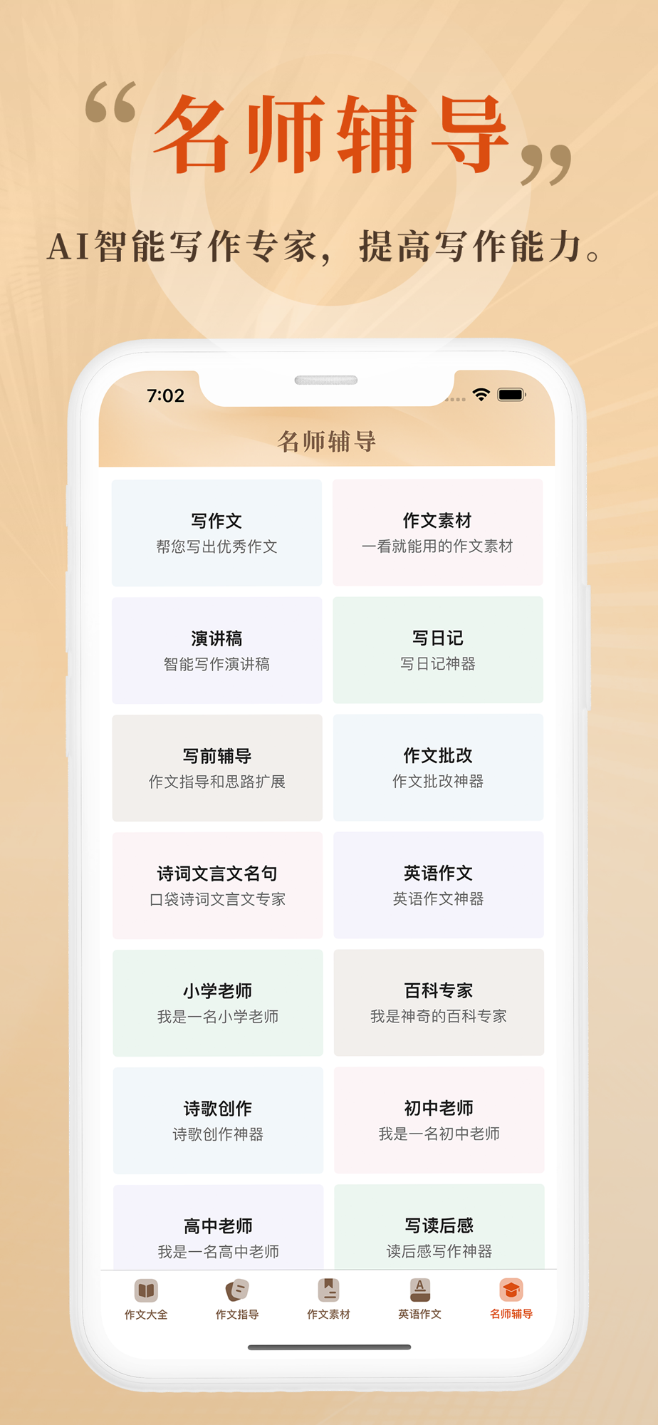 基于名师写作经验研发的智能AI写作辅导,包括:写作文,作文批改,作文精选素材,写日记,写前辅导,写读后感,诗歌诗词文言文创作,写演讲稿,英语作文写作,小学初中高中名师指点,百科专家等,旨在帮助您提高写作水平,写出好作文,您也可以随时和我们互动,让我们单独为您研发您想要的写作工具,为您实现私人订制服务。