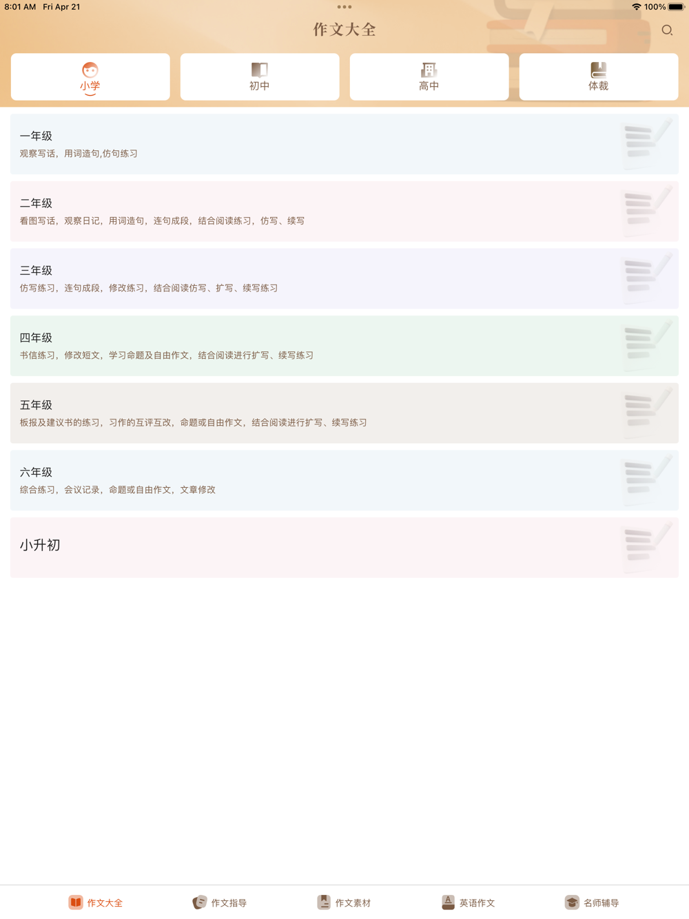 AI作文大全的作文大全模块包括小学作文,覆盖了小学作文包括:一年级作文,二年级作文,三年级作文,四年级作文,五年级作文,六年级作文,小升初满分作文;初中作文包括:初一作文,初二作文,初三作文,中考满分作文;高中作文包括:高一作文,高二作文,高三作文,高考满分作文。