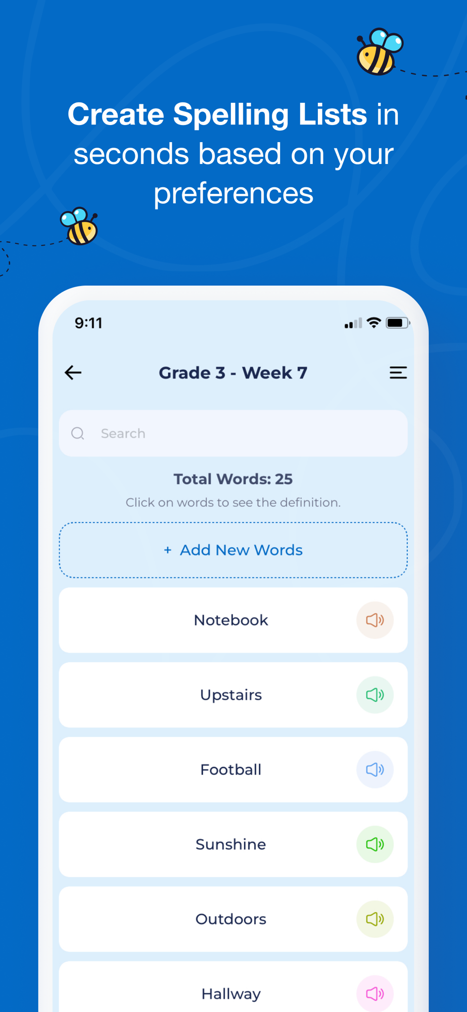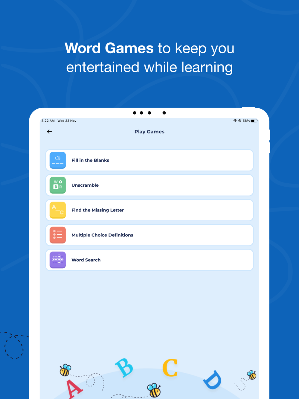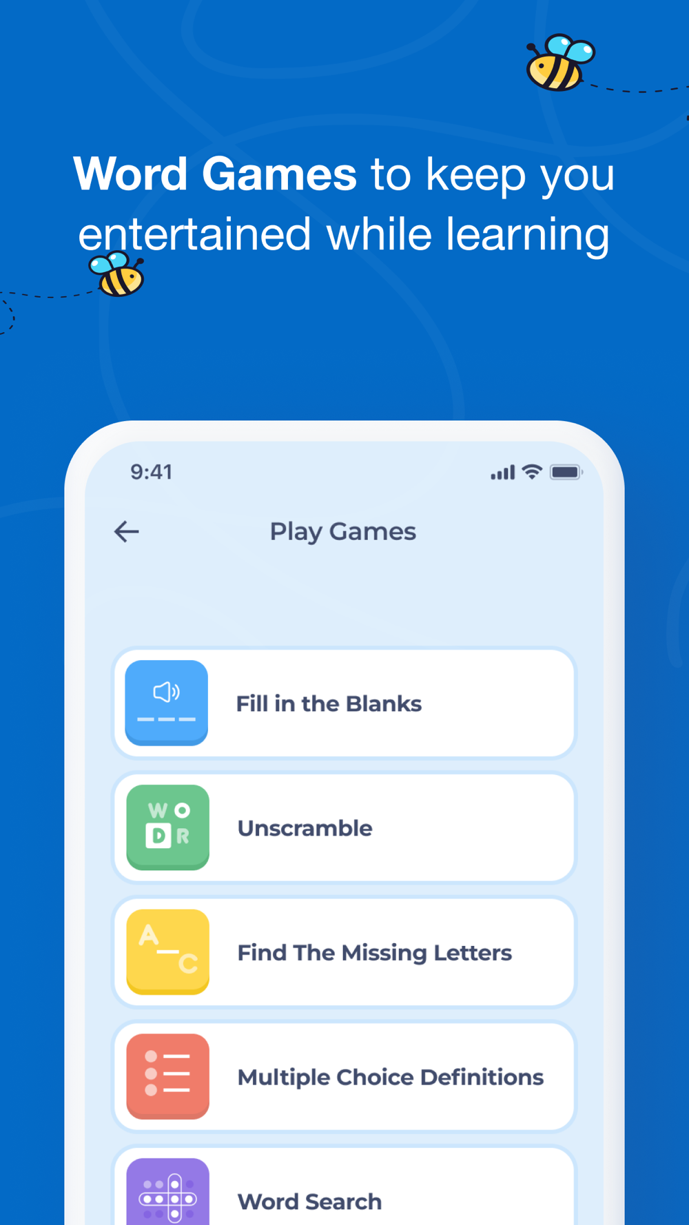 Buzzy Bee is a study companion that helps students learn how to spell and prepare independently for spelling tests. With Buzzy Bee you can create custom spelling lists in less time by using the handy-dandy scan and import features. Plus, with the built-in dictionary, your child never has to guess word pronunciations or definitions. They’ll have fun getting ready for their next spelling test by playing their favorite word games. Let them practice every day with Buzzy Bee to improve their spelling skills! Buzzy Bee is the study companion you’ve been waiting for to help your child improve their vocabulary and ace their next spelling test!