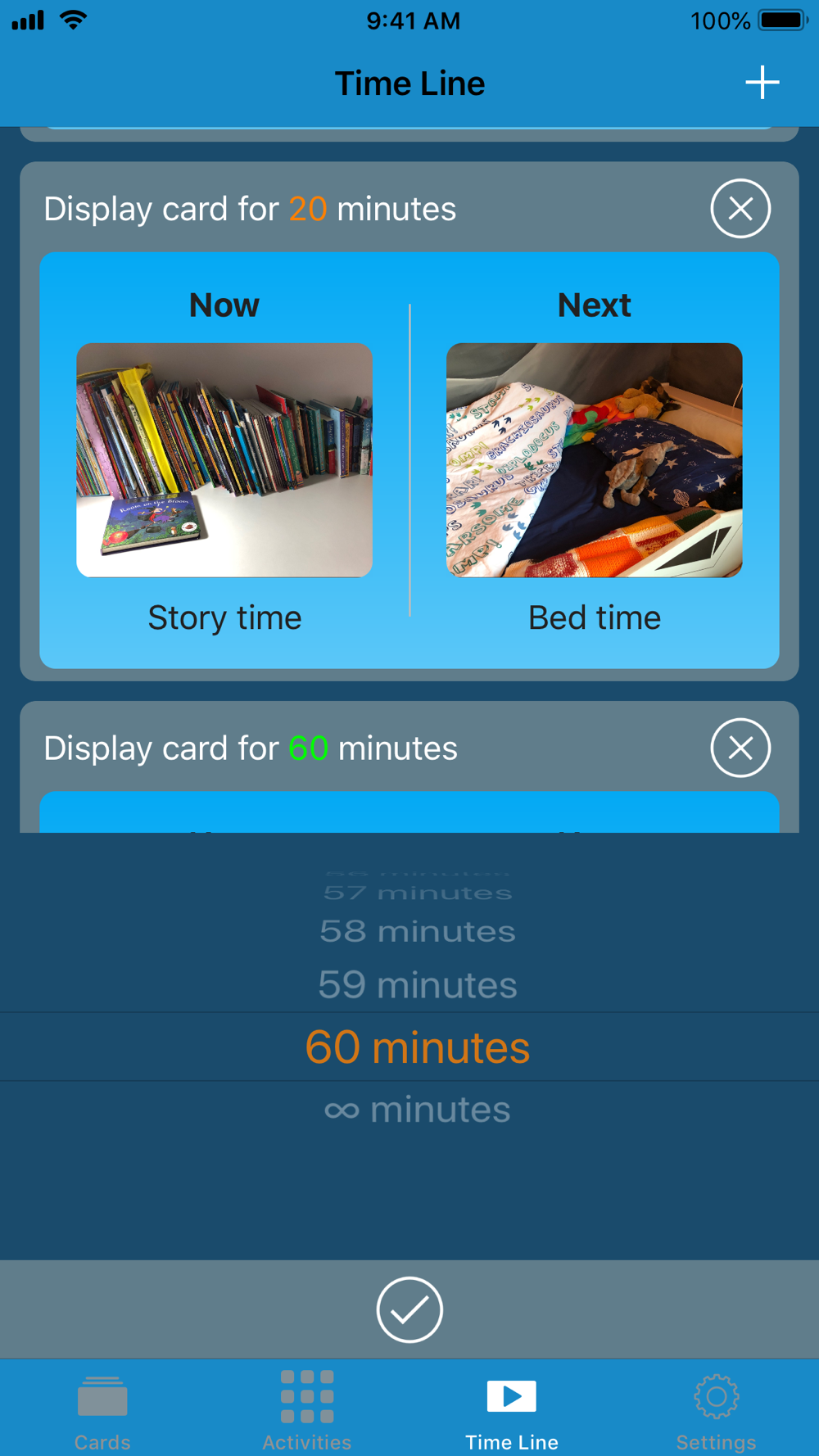 The unique Time Line feature enables you to take existing cards and create a time line of activities with cards moving on automatically after an adjustable amount of time - perfect for providing a structured set of activities. Disabled by default, a friendly sound can be enabled to notify you that an activity has changed.