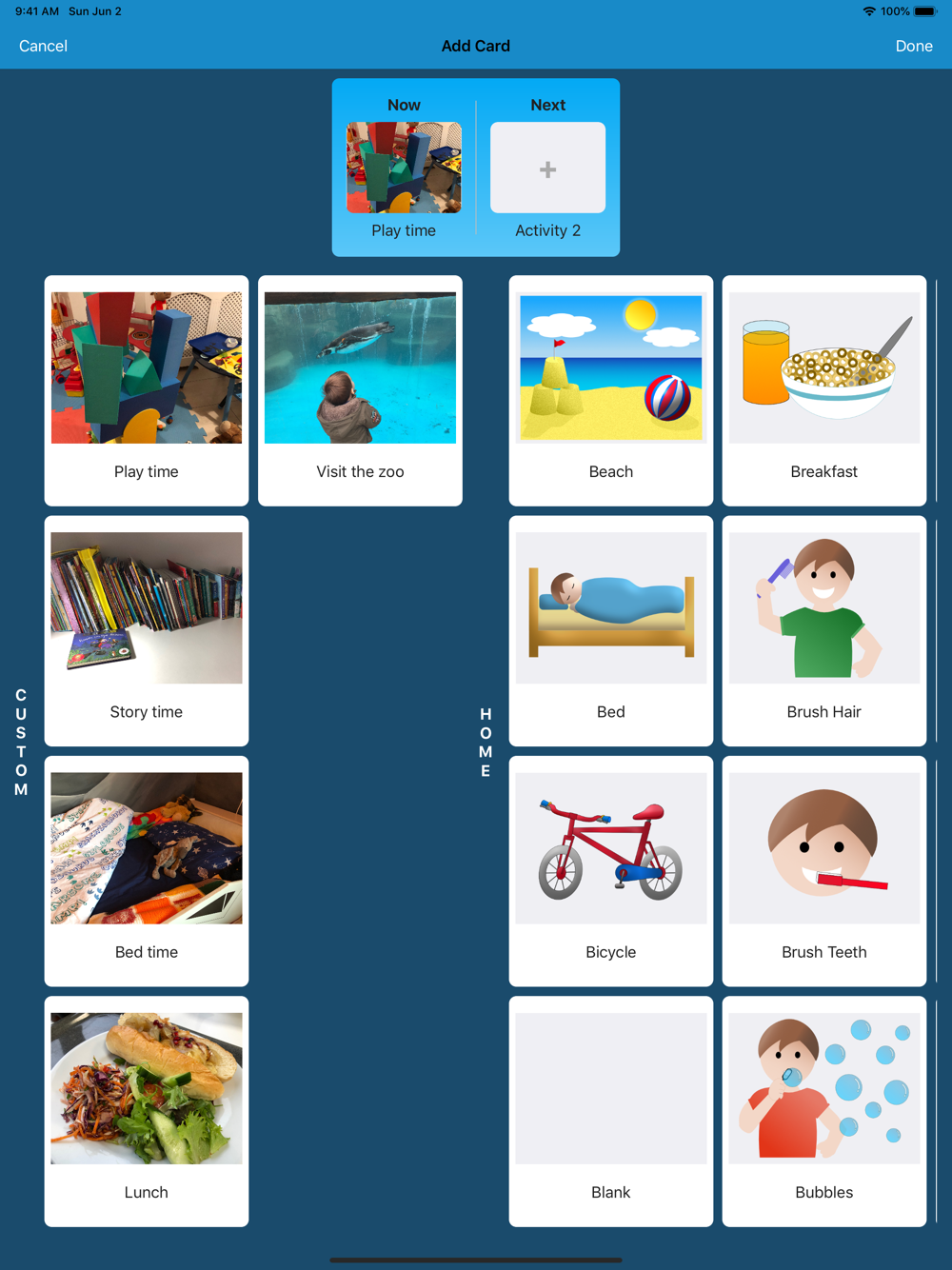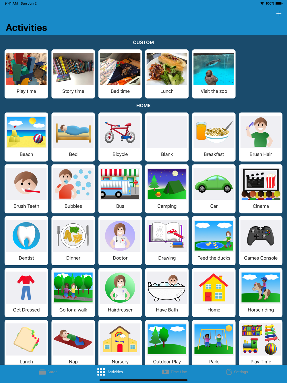 Featuring over 60 activities ranging from daily home life to school, and the ability to create your own custom activities featuring your own images, a vocabulary of activities can quickly be built and re-used.