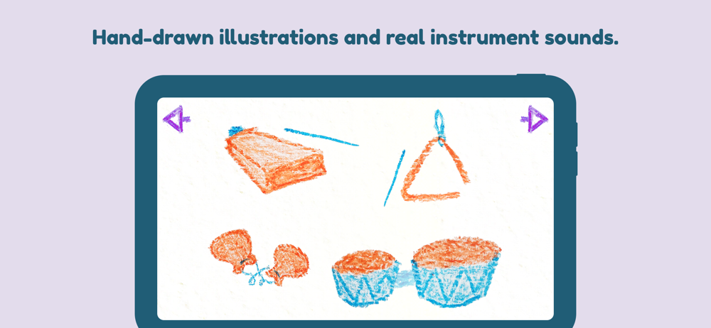 Hand-drawn illustrations and real instrument sounds.