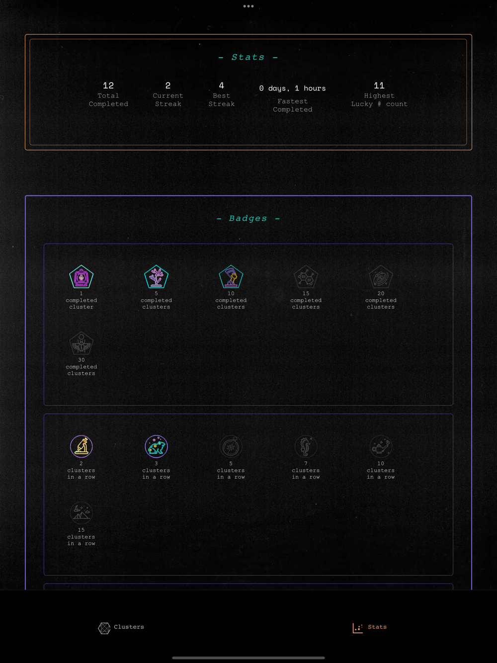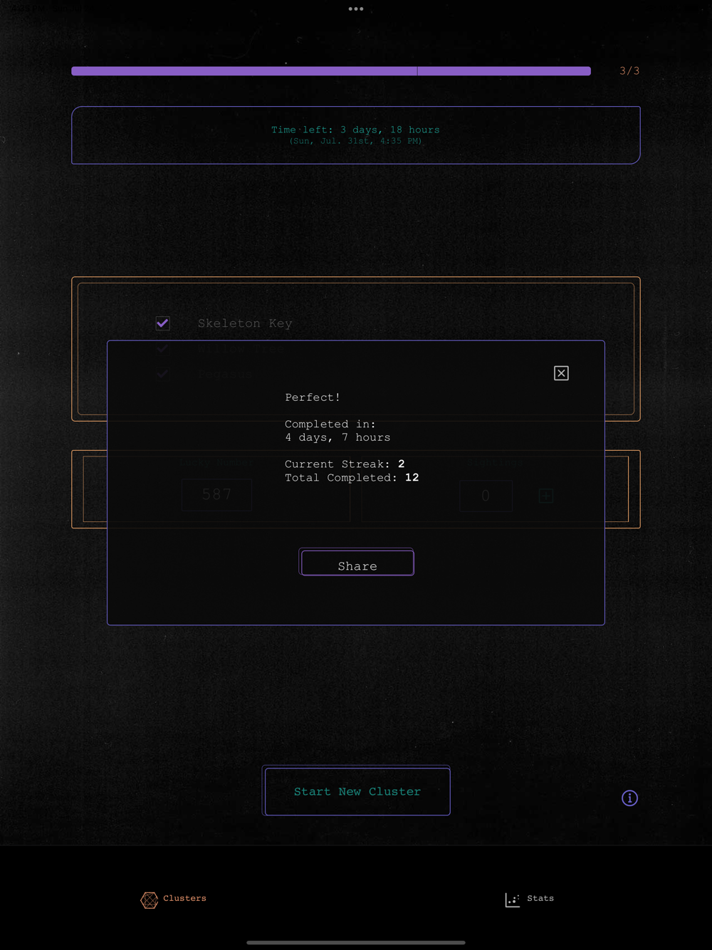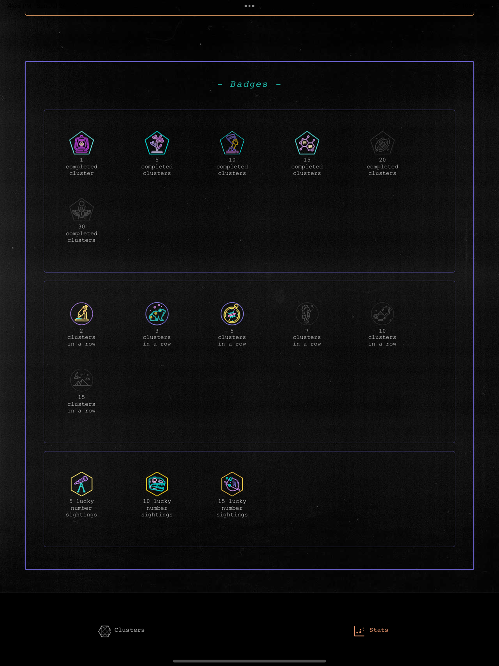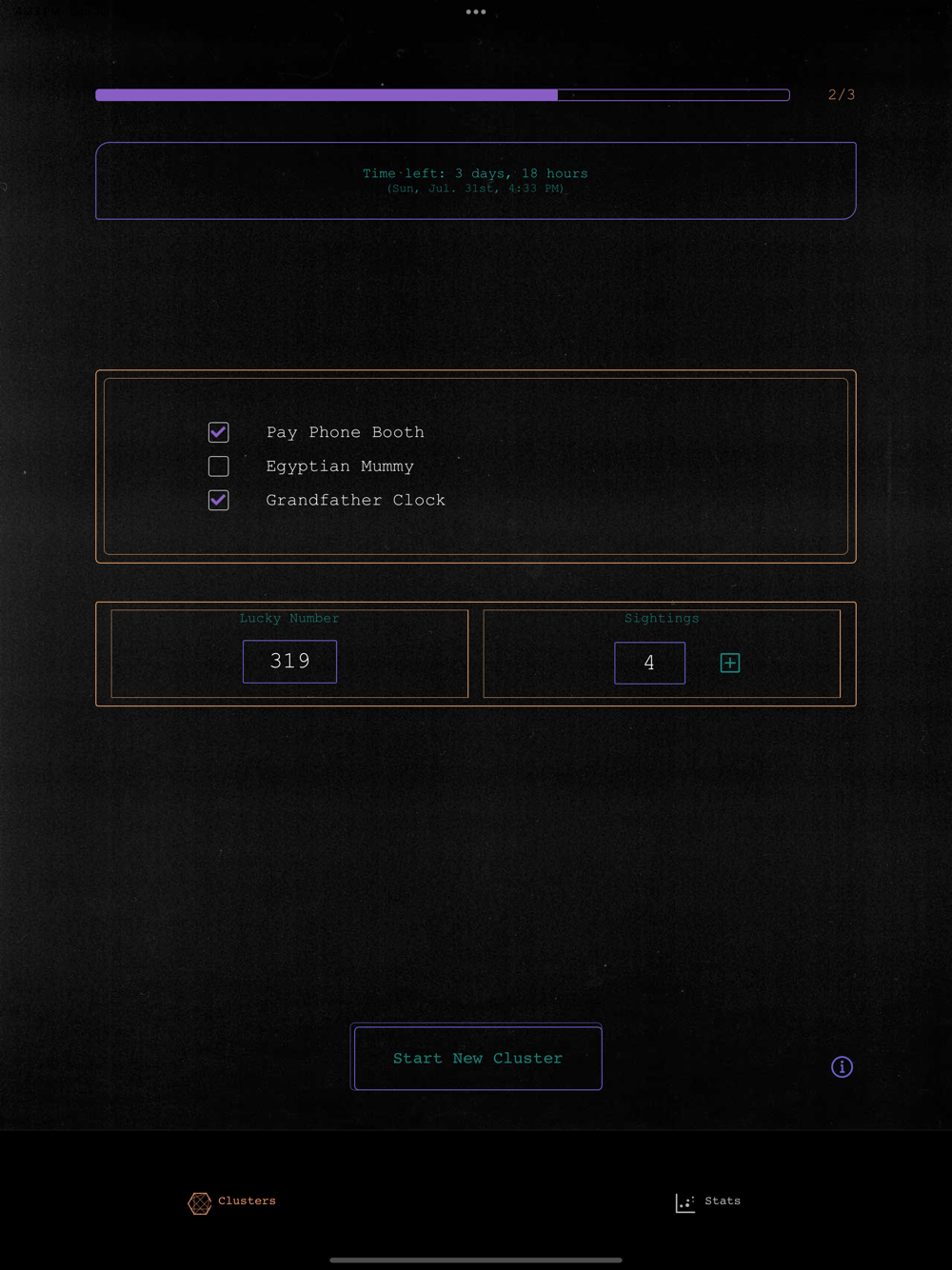 A cluster is a randomly generated group of 3 uncommon objects and a 3 digit lucky number.