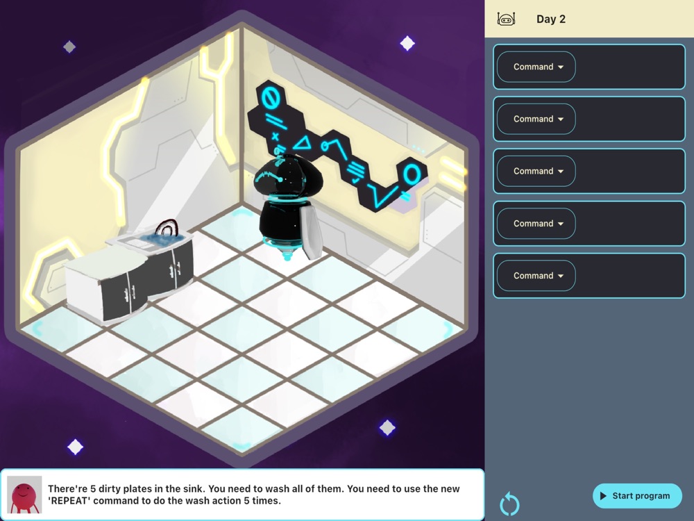 Simple interactive story about a robot who becomes a head chef in a restaurant that will teach your child the basic concepts of coding.