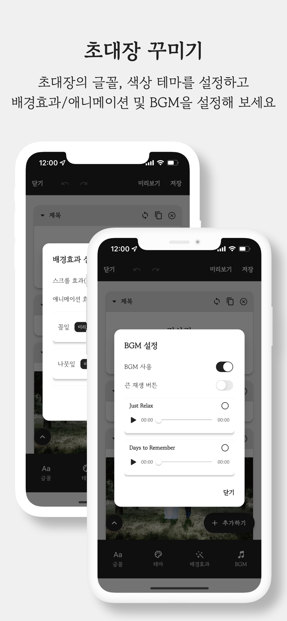 아이템 추가 외에도 초대장의 글꼴, 색상 테마, 배경 효과, BGM을 설정할 수 있어요.