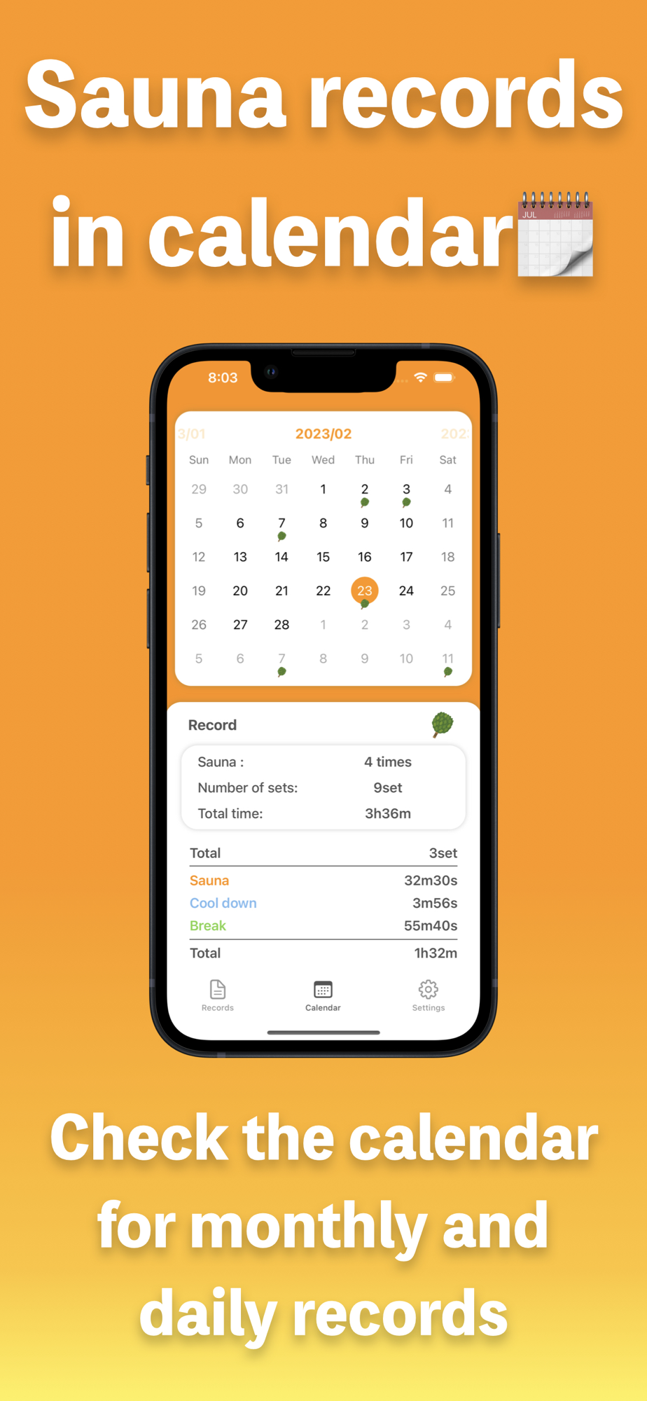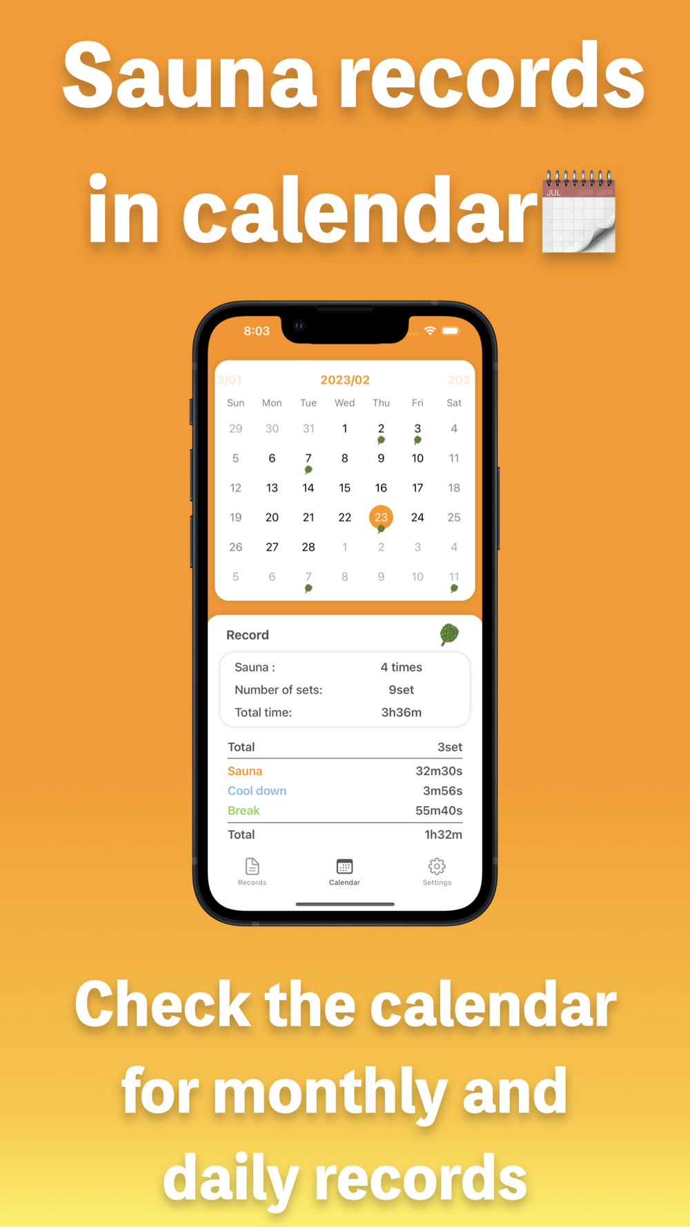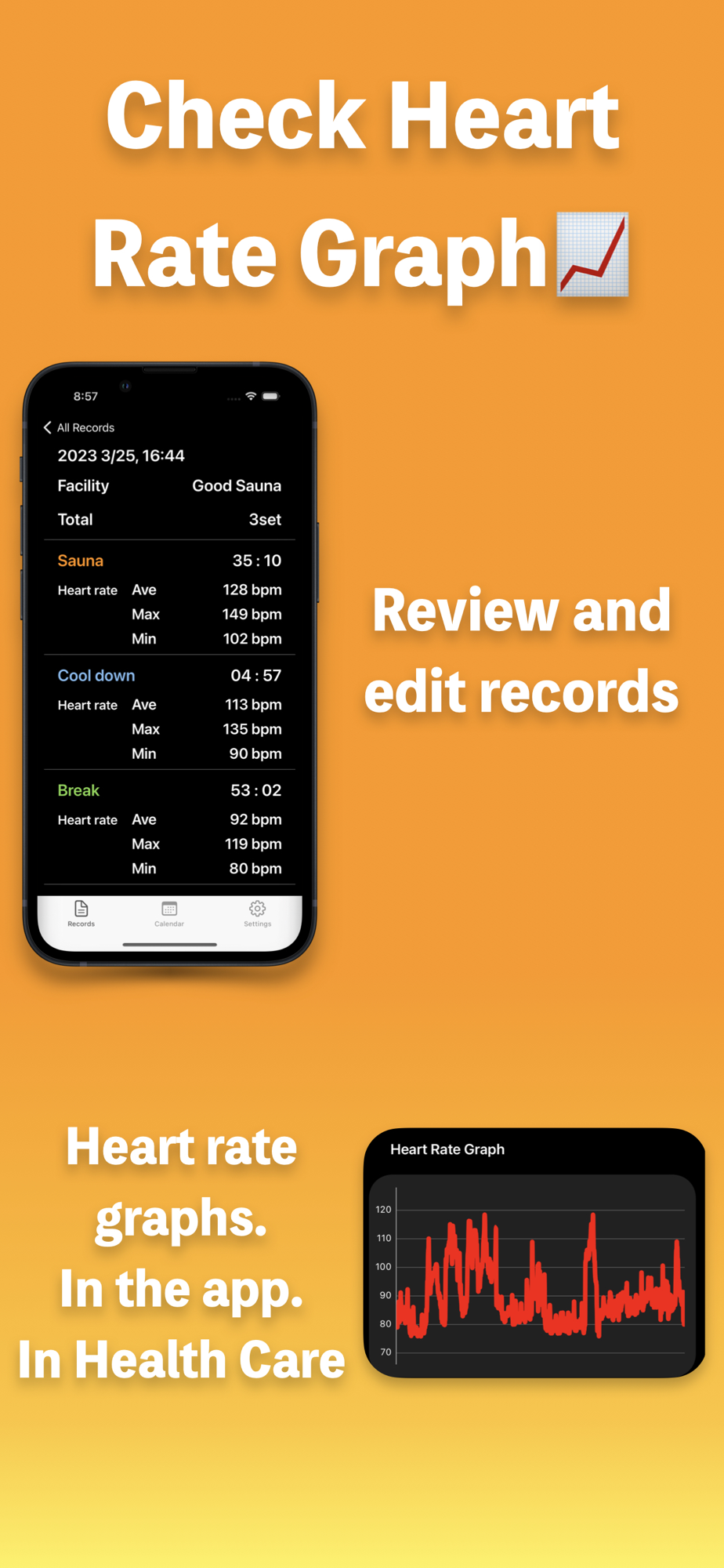Sauna Record records the time and heart rate for each set of sauna, water bath, and rest, and the estimated sweat volume in the sauna.