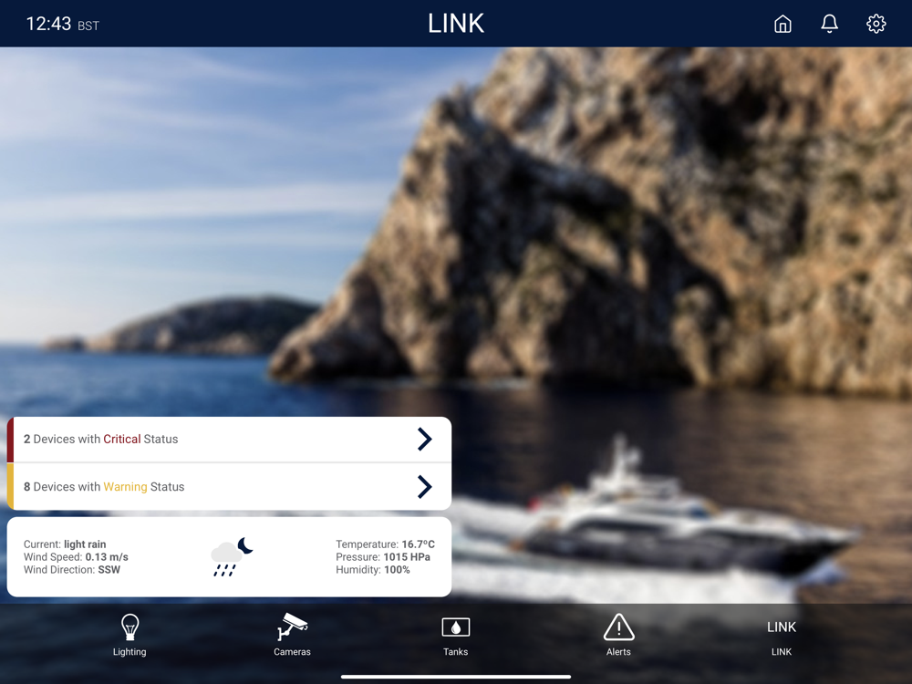 The LINKtouchscreen app offers monitoring and control of a huge range of devices, including lighting, climate, tanks, security cameras, engine data and more. The intuitive design ensures it’s easy to use and both light and dark modes are available. Set up custom interfaces to change the background image as well as allow access to different areas of the app, for example, the crew iPad could access all alarms, engine, tanks and bilge data whereas guest iPads only have access to lighting and climate control.