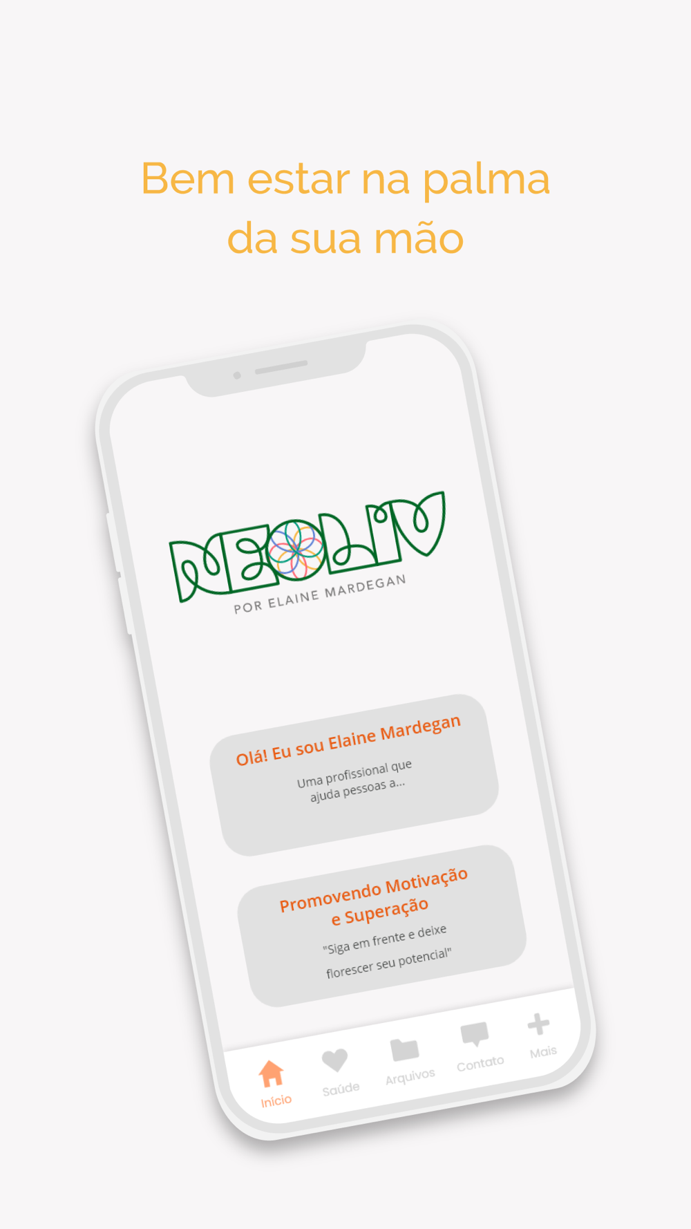 Além do atendimento presencial, on-line, sua experiência será ainda mais incrível aqui no app NeoLiv- Elaine Mardegan, com materiais de desenvolvimento, aprendizados e informações produzidos com muito carinho para que você se sinta mais feliz.