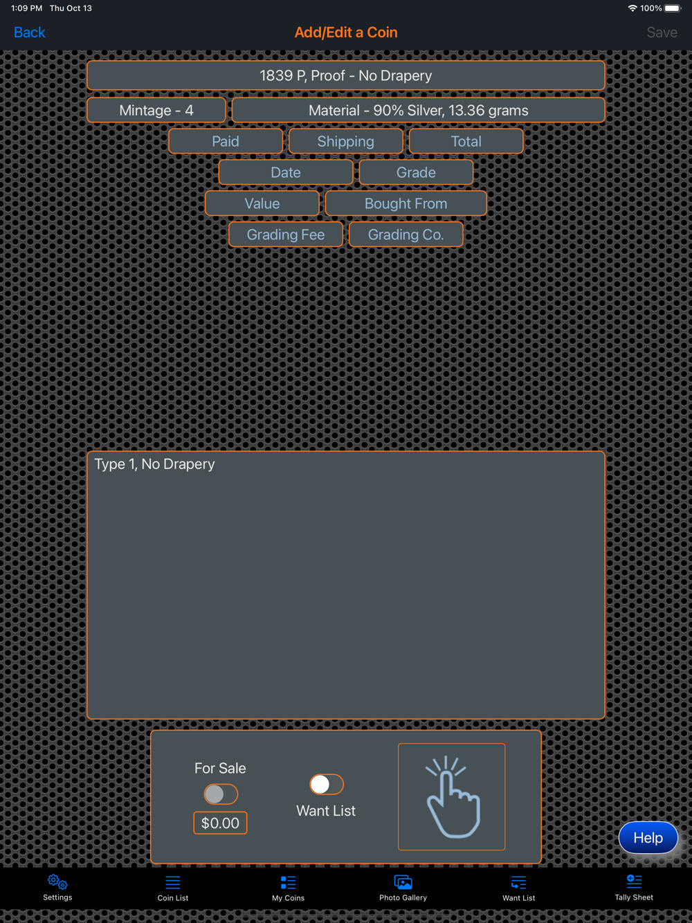 This app will provide the ability for the user to organize, track and manage their collection of coins. Images of each coin can be included with the collection. There is also a means within the app for the user to peruse all of the images in an entertaining manner. The app has three (3) color themes which help to make the app more enjoyable. A running tally of the cost for the entire collection is provided. A want list is also included in the app to allow you to ear-mark coins that you are searching for.